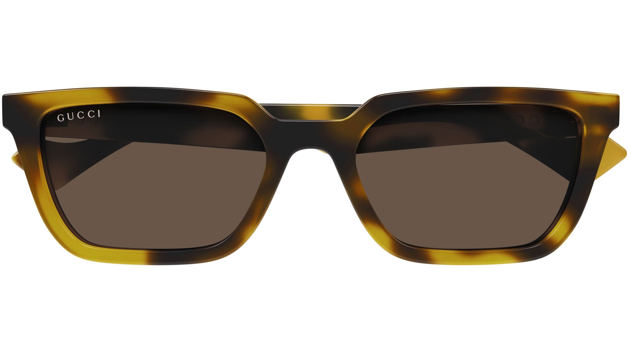 Occhiali da sole Gucci linea Lettering modello GG1539S rettangolari in iniettato codice colore 005 avana giallo opale maculato lucido con aste giallo e lenti color marrone tinta unita.