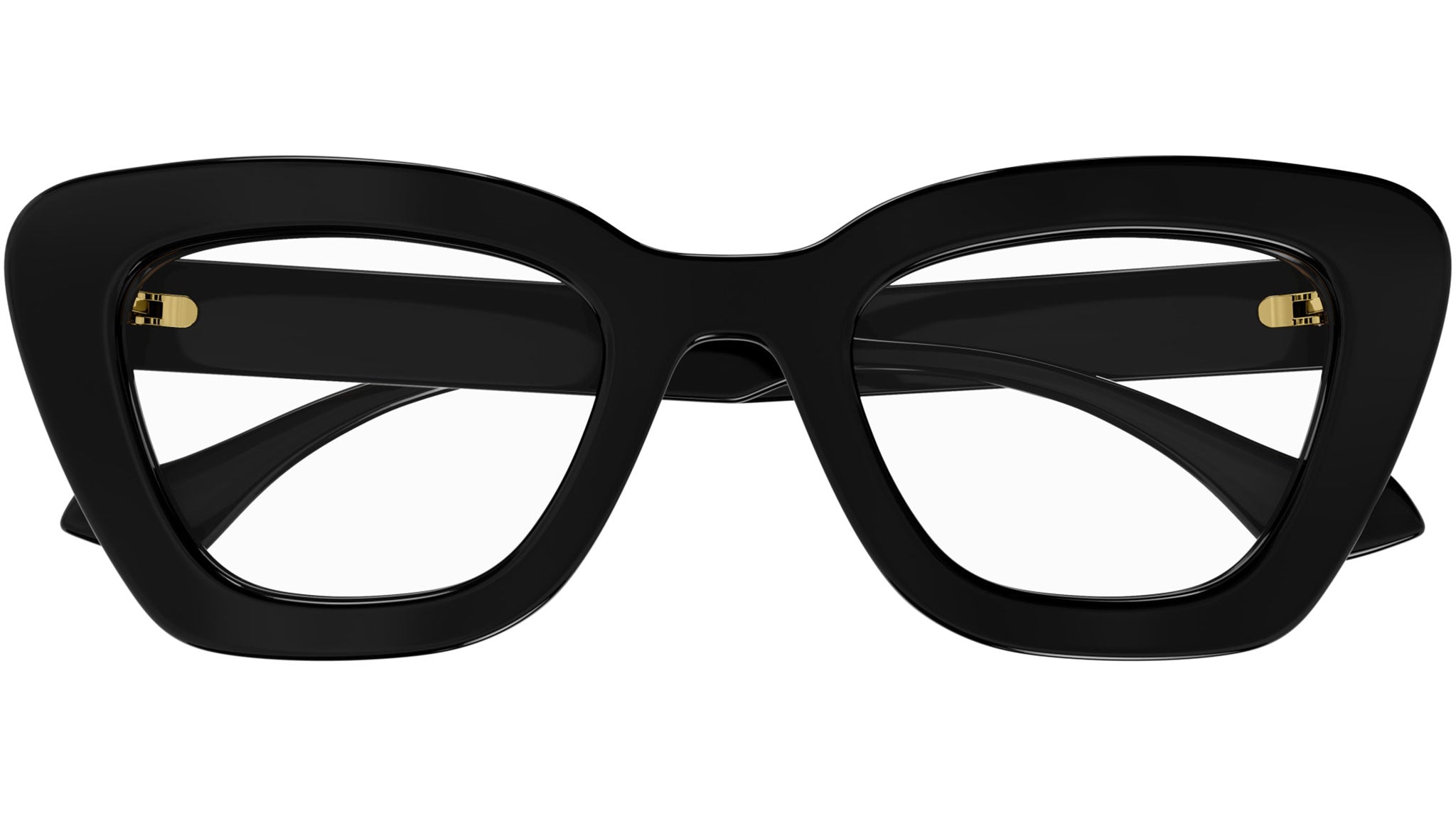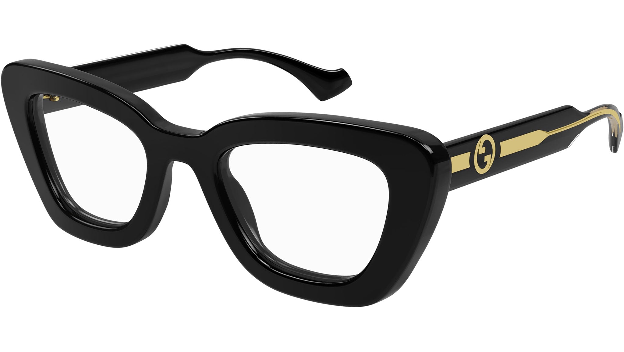 Occhiali da vista Gucci modello GG1555O linea GG Logo in acetato riciclato forma a gatto codice colore 001 nero lucido tinta unita con aste in cristallo trasparente e lenti demo. Rivenditore autorizzato Gucci online. Gli occhiali vengono consegnati con custodia e accessori originali e sono coperti dalla garanzia ufficiale di 12 mesi del produttore.