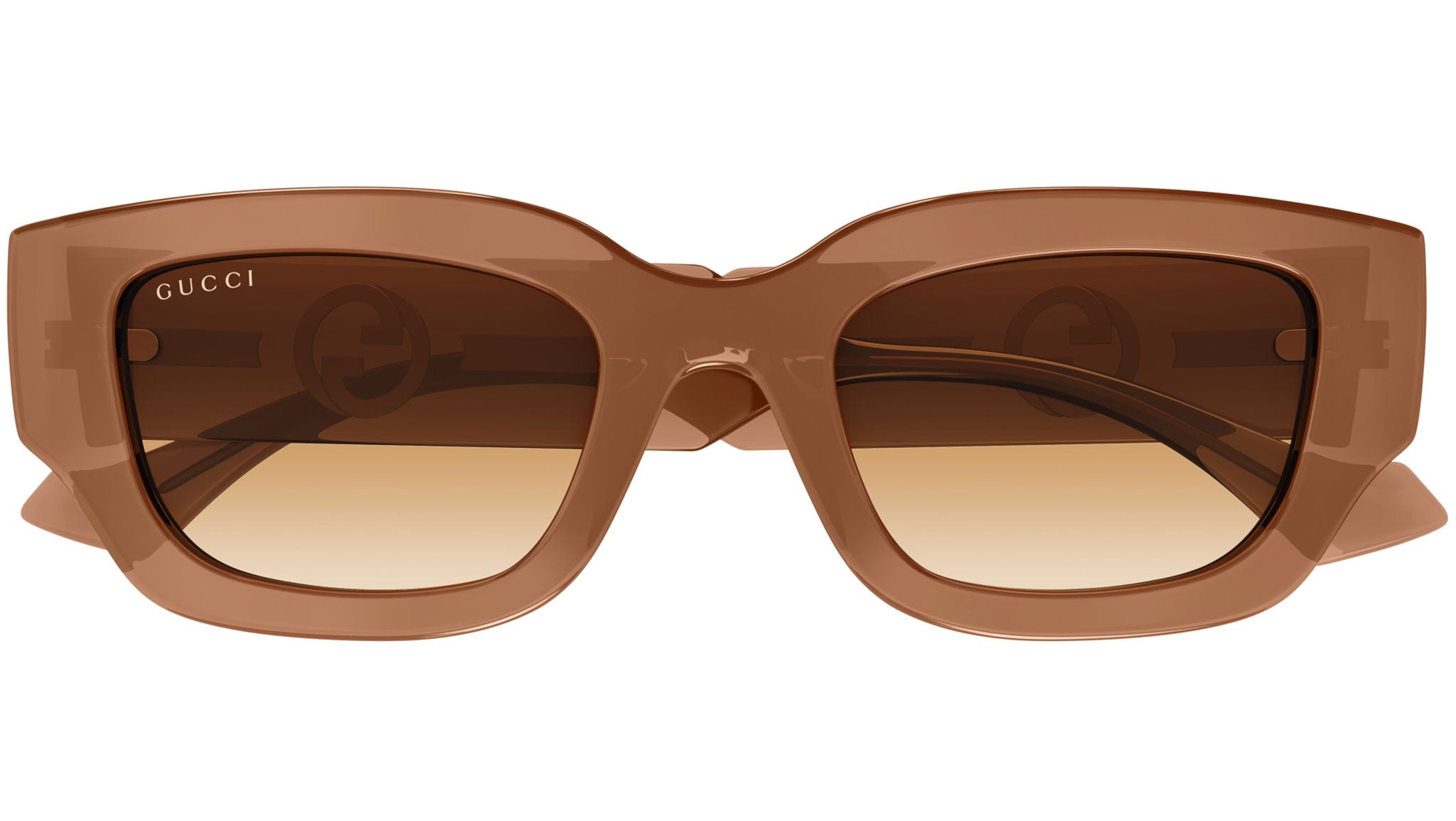 Occhiali da sole Gucci linea GG Logo modello GG1558SK pantos in iniettato codice colore 004 marrone ambrato trasparente lucido con aste marrone e lenti color arancione sfumato.