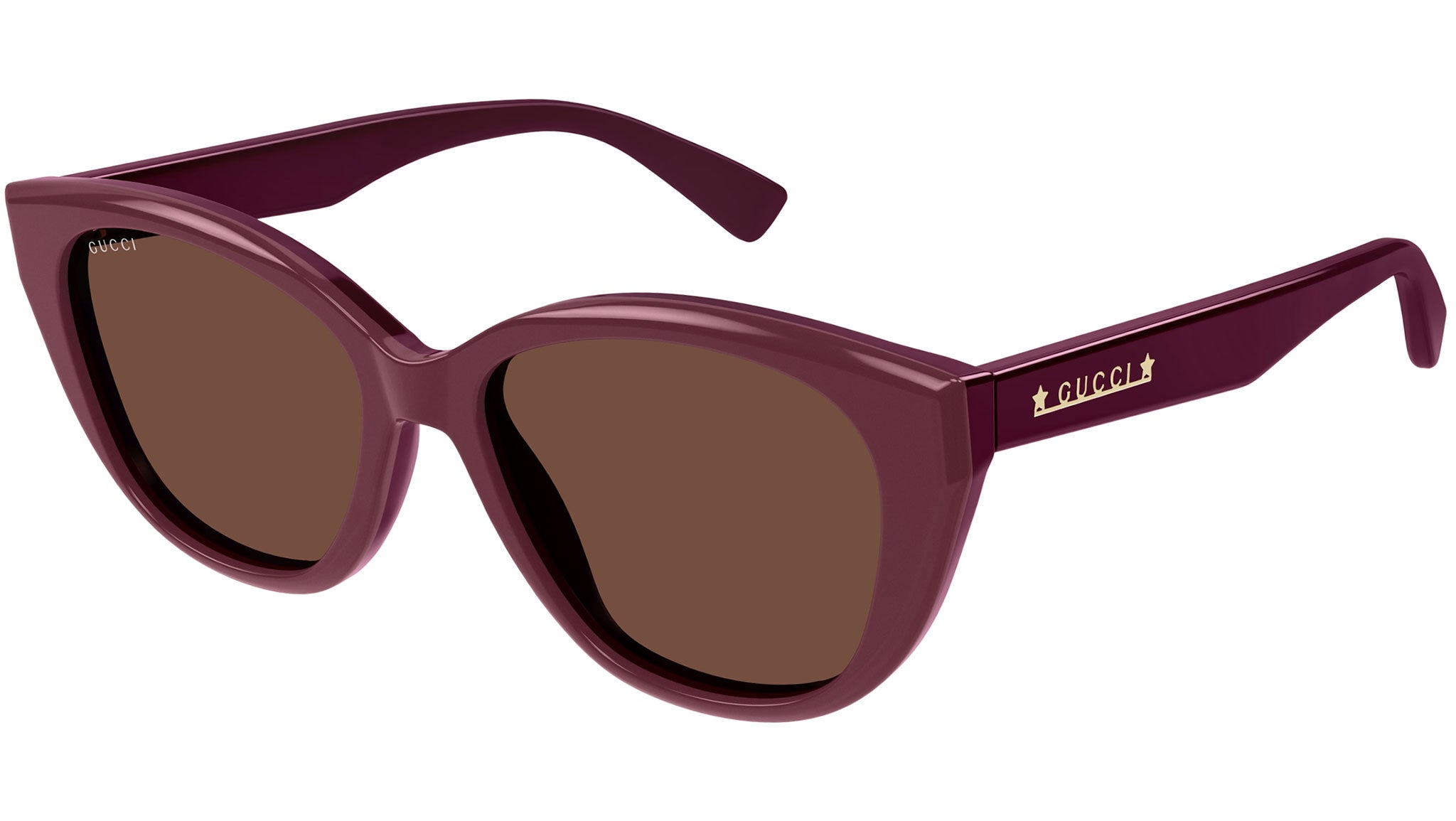 Occhiali da sole Gucci linea Lettering modello GG1588S cat eye in acetato riciclato codice colore 003 bordeaux glossy lucido con aste rosso borgogna e lenti color marrone tinta unita.