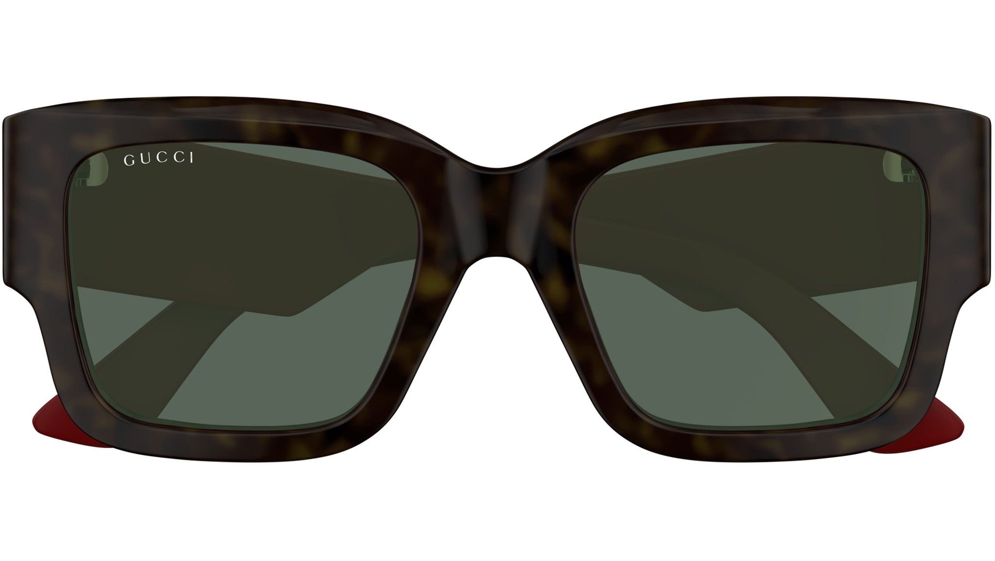 Occhiali da sole Gucci modello GG1663S linea GG Logo in acetato riciclato forma rettangolare codice colore 002 tartaruga scuro lucido con aste rosso e lenti verde scuro tinta unita. Rivenditore autorizzato Gucci online. Gli occhiali vengono consegnati con custodia e accessori originali e sono coperti dalla garanzia ufficiale di 12 mesi del produttore.