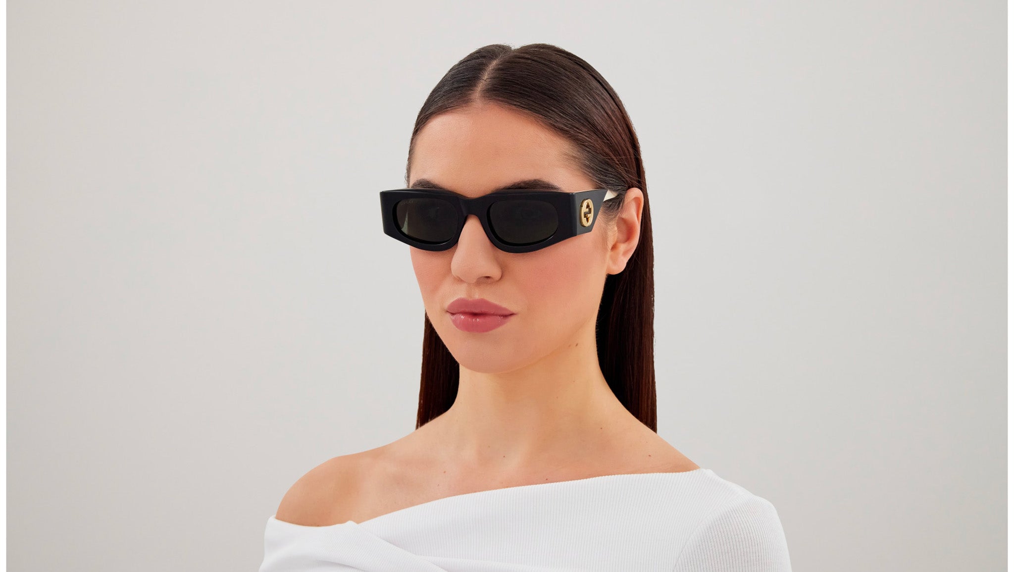 Occhiali da sole Gucci modello GG1664S linea GG Logo in acetato riciclato forma rettangolare codice colore 001 nero lucido con aste avorio e lenti grigio tinta unita. Rivenditore autorizzato Gucci online. Gli occhiali vengono consegnati con custodia e accessori originali e sono coperti dalla garanzia ufficiale di 12 mesi del produttore.
