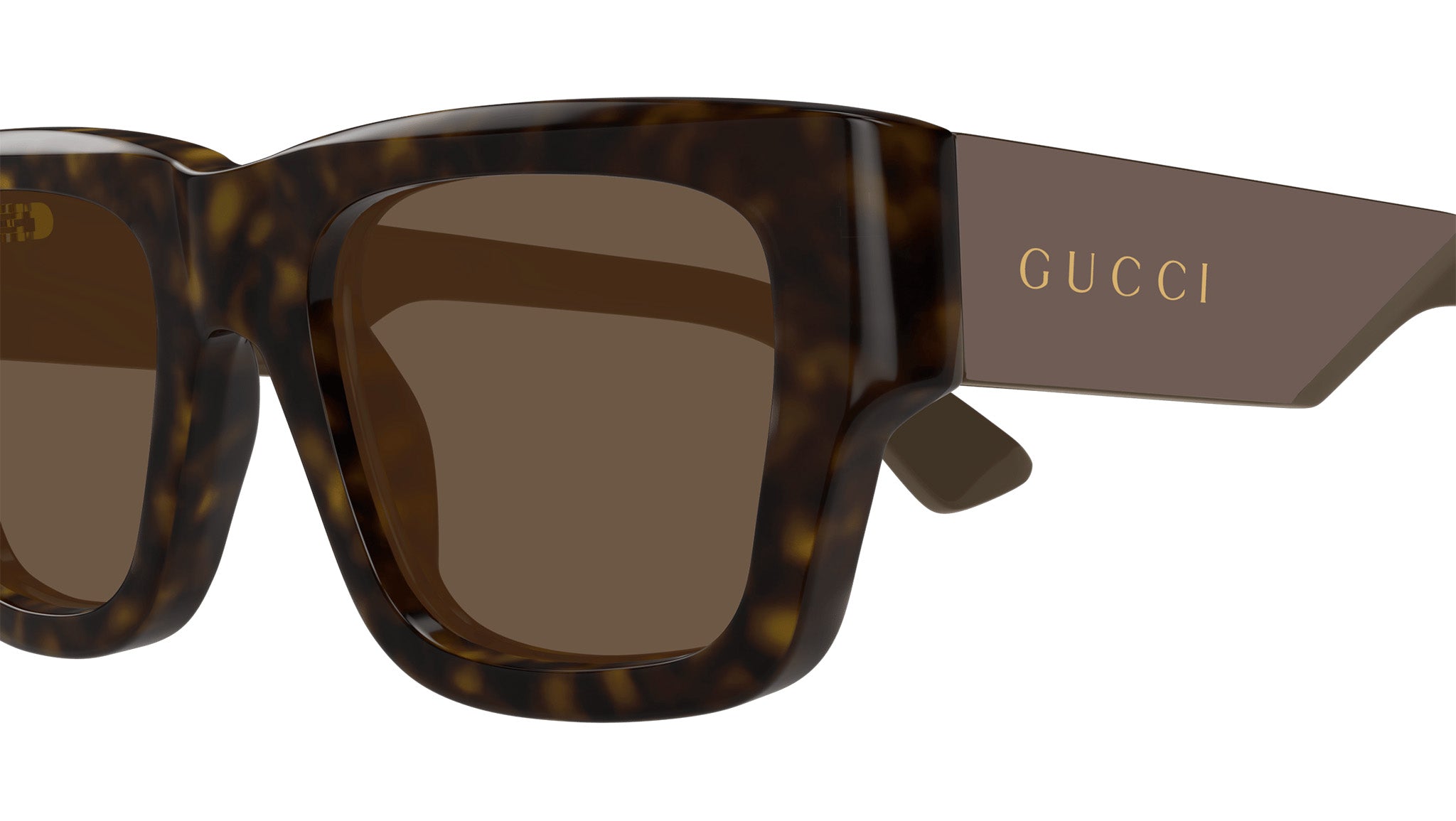 Occhiali da sole Gucci modello GG1668S linea Lettering in acetato riciclato forma rettangolare codice colore 005 tartaruga scuro lucido con aste verde e lenti marrone tinta unita. Rivenditore autorizzato Gucci online. Gli occhiali vengono consegnati con custodia e accessori originali e sono coperti dalla garanzia ufficiale di 12 mesi del produttore.