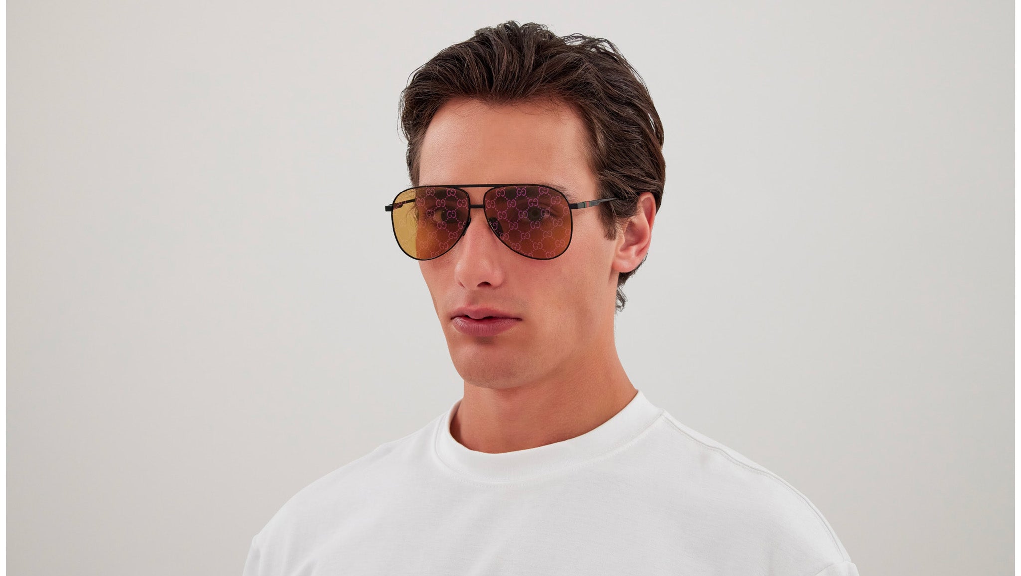 Occhiali da sole Gucci modello GG1677S linea Web in metallo forma aviatore codice colore 005 nero lucido con aste nero e lenti solido nicotina + cliché Guccissima rosa flash a specchio. Rivenditore autorizzato Gucci online. Gli occhiali vengono consegnati con custodia e accessori originali e sono coperti dalla garanzia ufficiale di 12 mesi del produttore.
