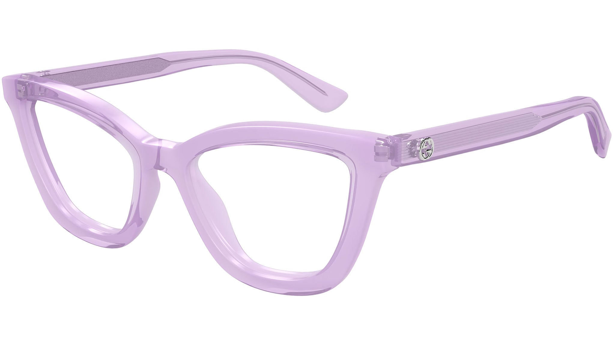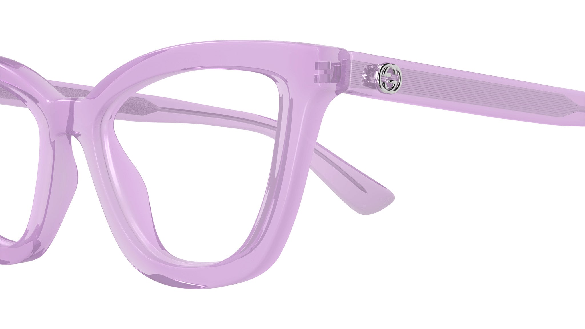Occhiali da vista Gucci modello GG1686O linea GG Logo in acetato riciclato forma pantos lilla trasparente lucido con aste in viola e lenti demo. Rivenditore autorizzato Gucci online. Gli occhiali vengono consegnati con custodia e accessori originali e sono coperti dalla garanzia ufficiale di 12 mesi del produttore.