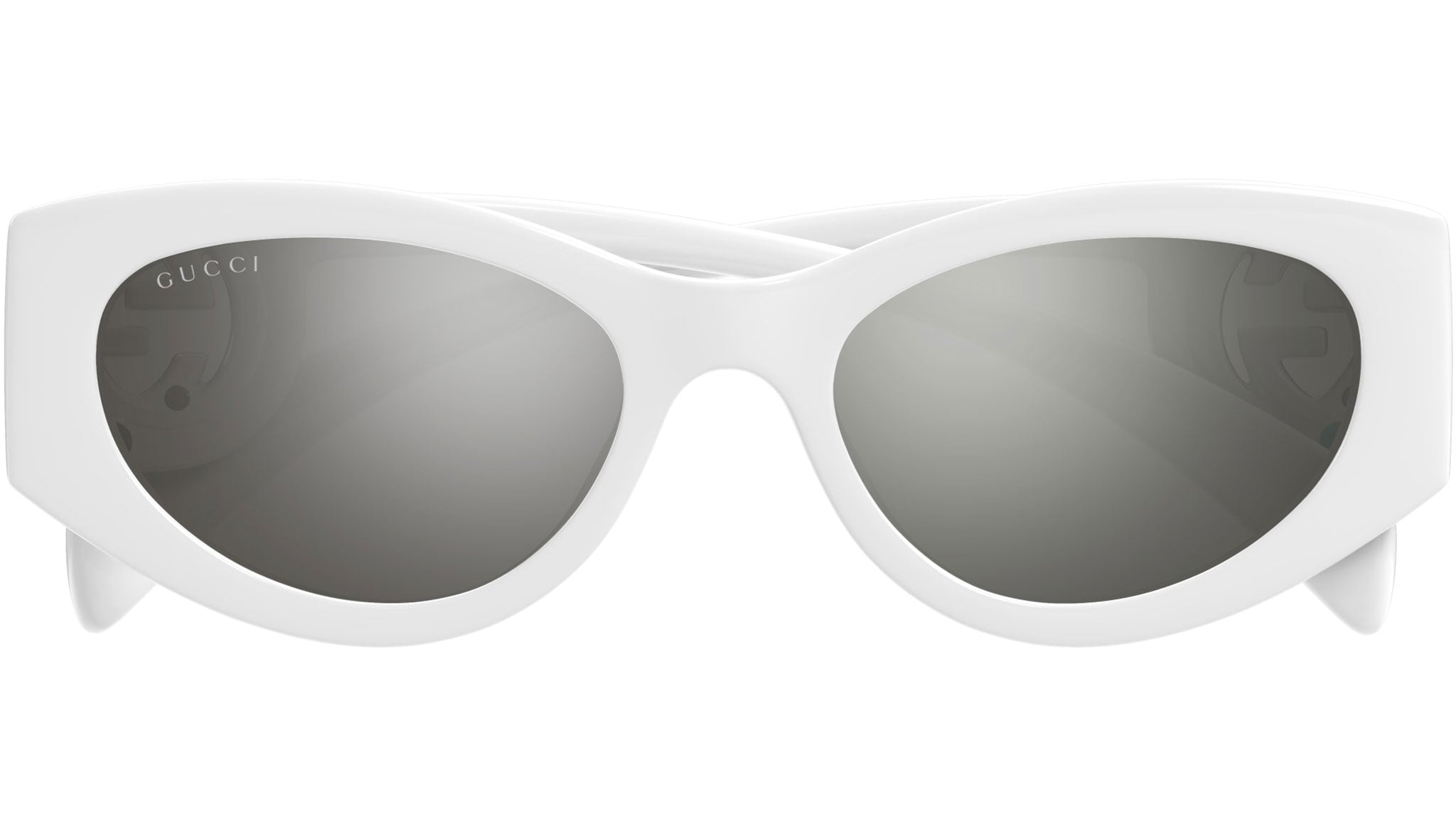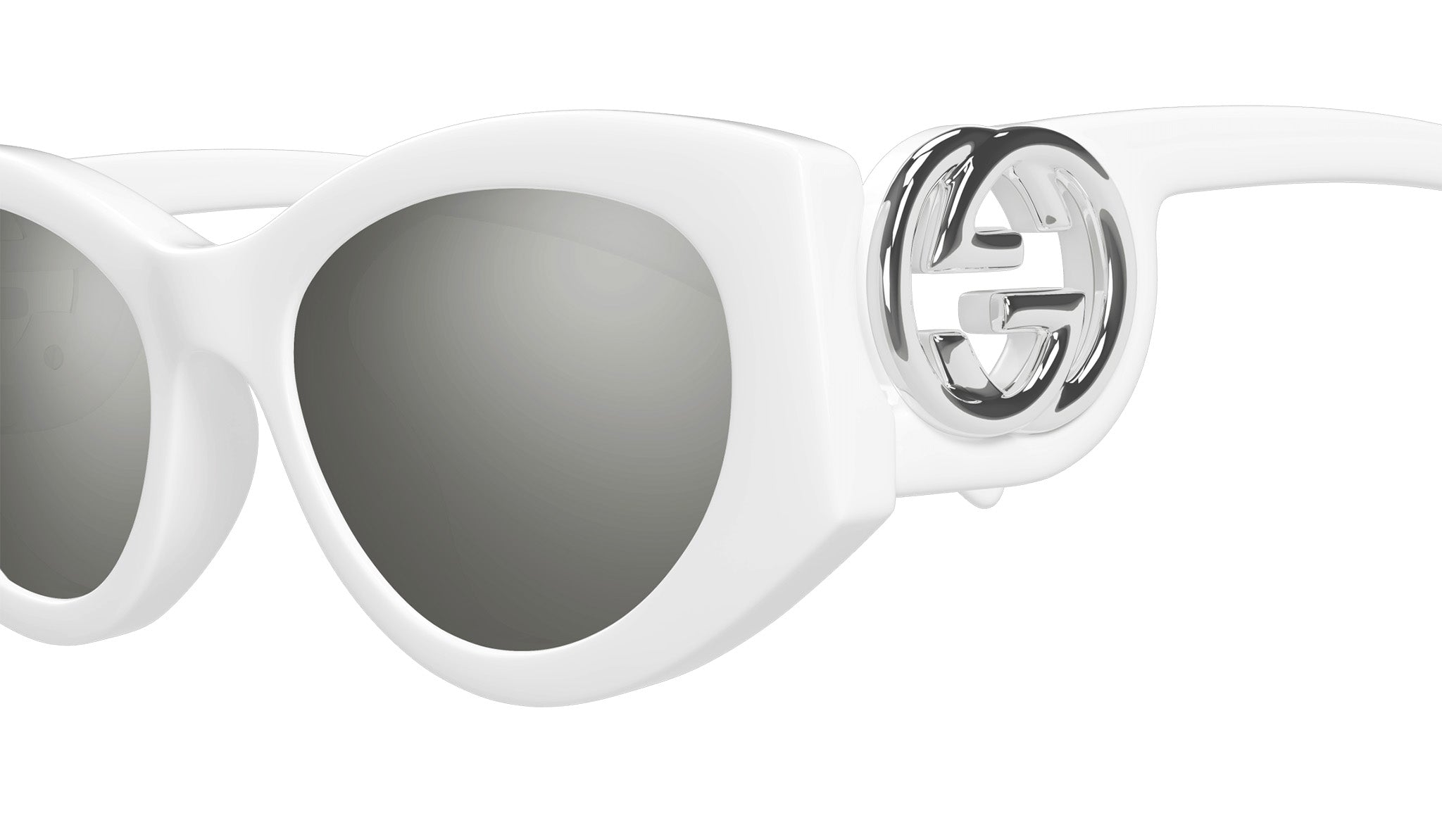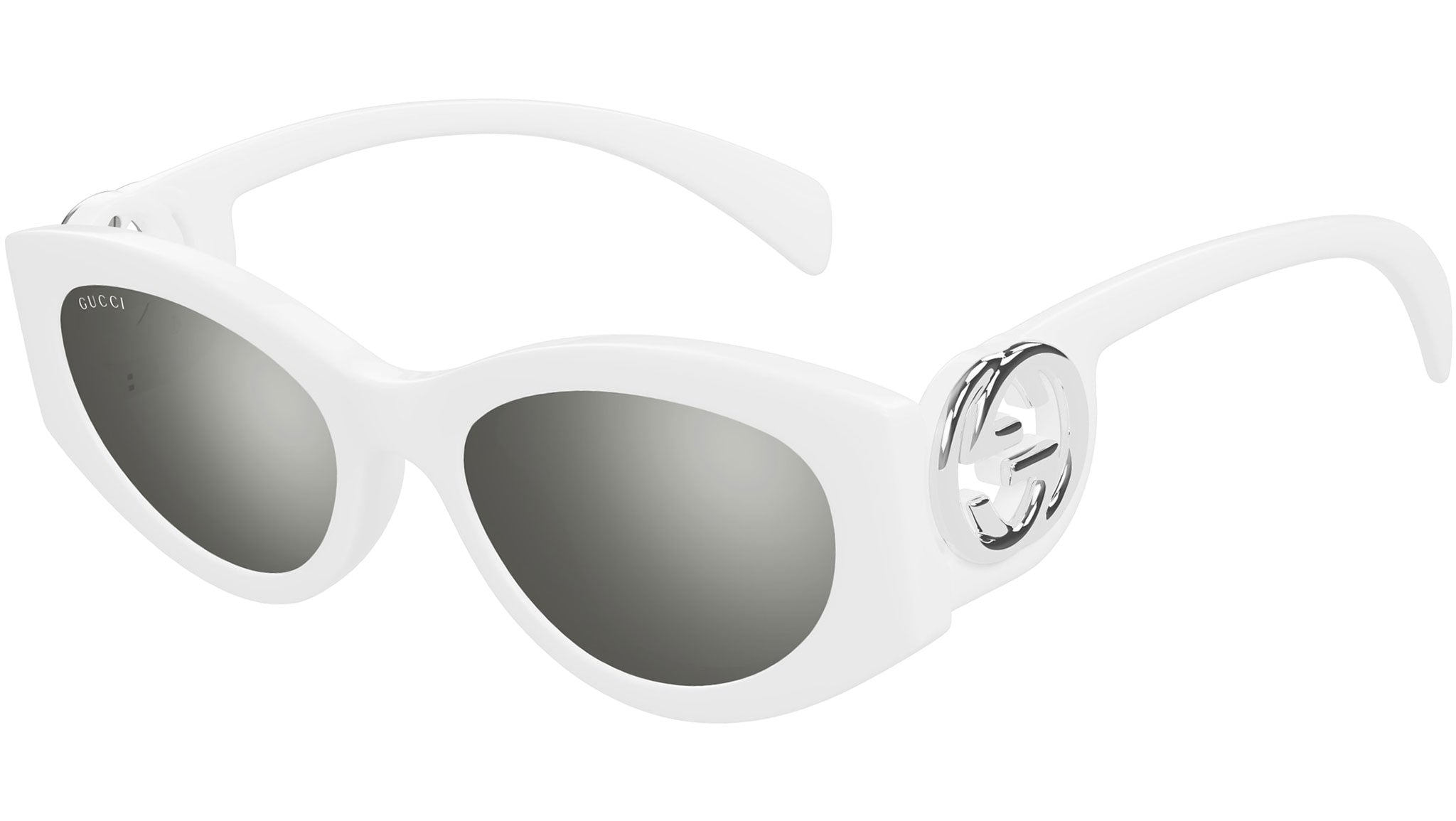 Occhiali da sole Gucci modello GG1691S linea GG Logo in iniettato forma a gatto codice colore 006 bianco sporco lucido con aste bianco e lenti grigio pieno + flash argento. Rivenditore autorizzato Gucci online. Gli occhiali vengono consegnati con custodia e accessori originali e sono coperti dalla garanzia ufficiale di 12 mesi del produttore.