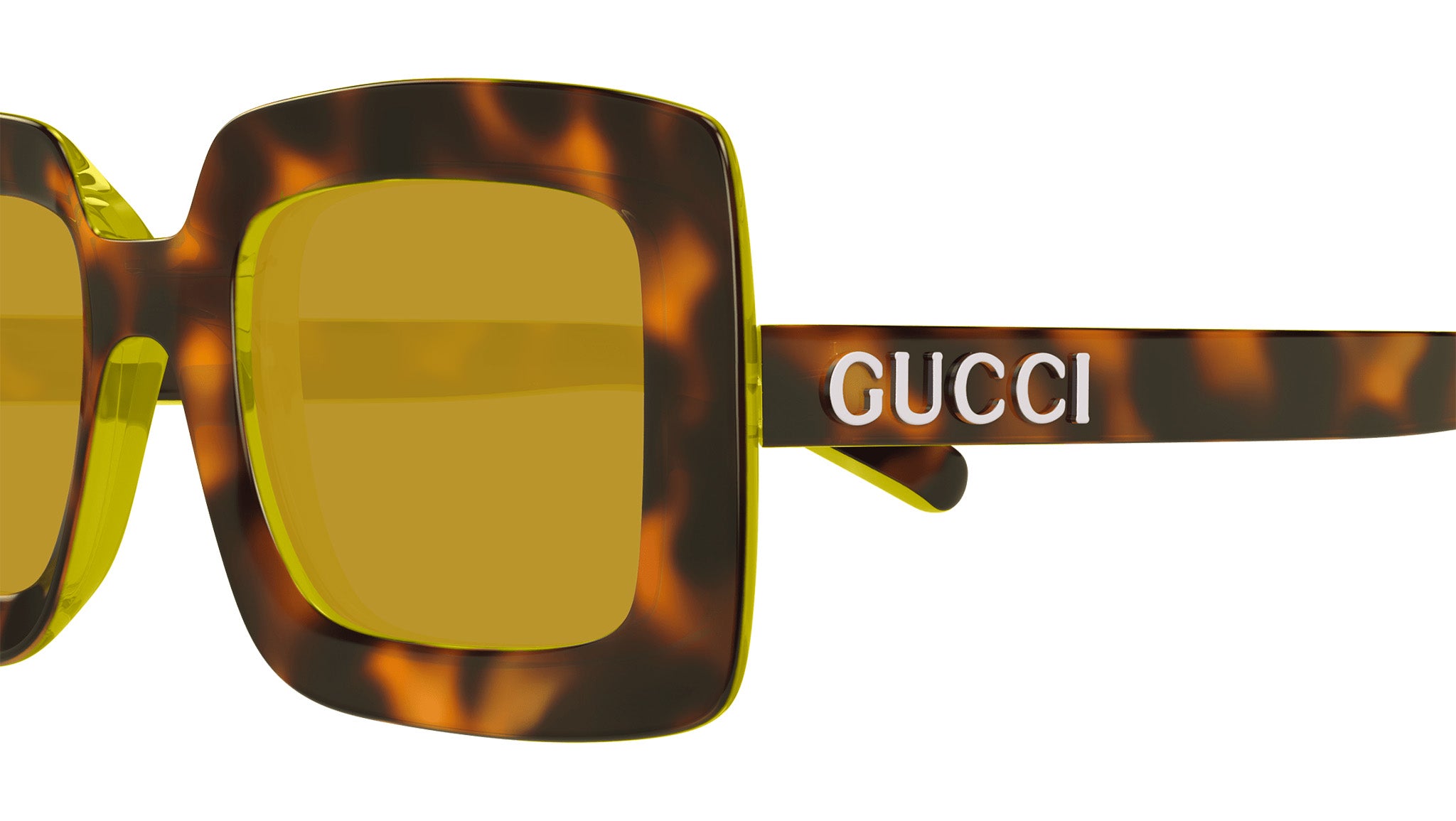 Occhiali da sole Gucci modello GG1718S linea Lettering in iniettato forma rettangolare codice colore 002 avana maculato lucido + giallo con aste tartaruga e lenti beige nicotine tinta unita. Rivenditore autorizzato Gucci online. Gli occhiali vengono consegnati con custodia e accessori originali e sono coperti dalla garanzia ufficiale di 12 mesi del produttore.