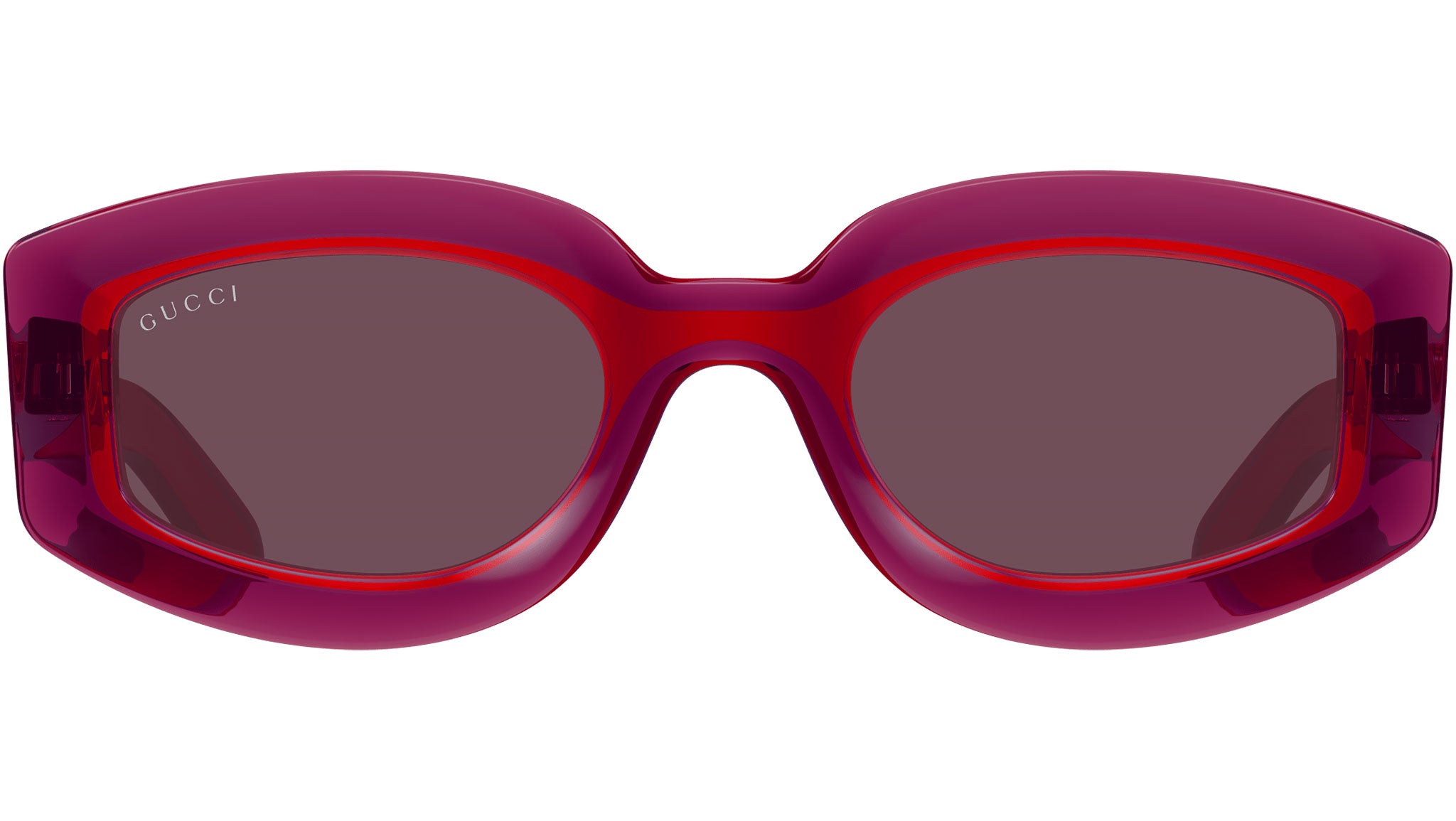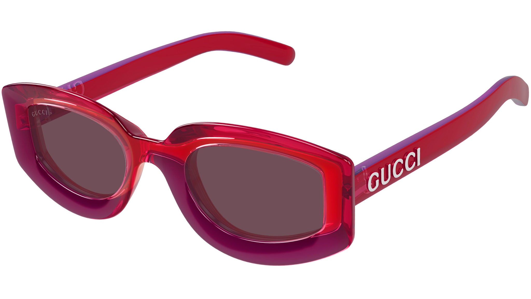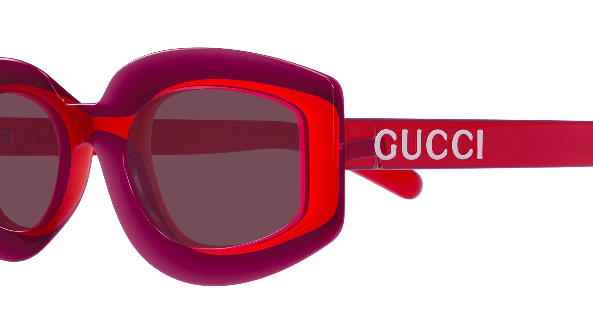 Occhiali da sole Gucci modello GG1719S linea Lettering in iniettato forma geometrica codice colore 004 rosso trasparente lucido / viola con aste rosso e lenti borgogna tinta unita. Rivenditore autorizzato Gucci online. Gli occhiali vengono consegnati con custodia e accessori originali e sono coperti dalla garanzia ufficiale di 12 mesi del produttore.