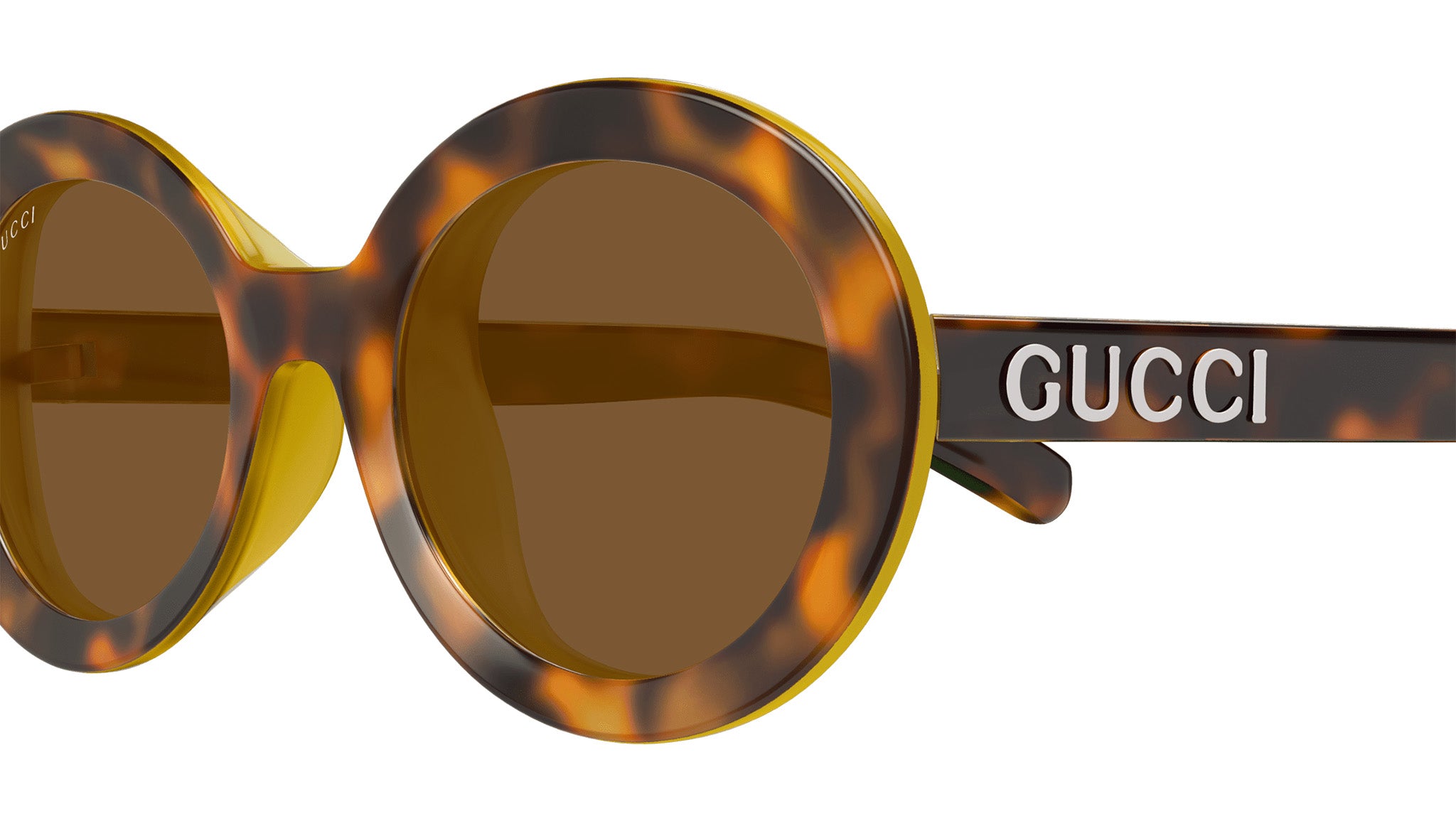 Occhiali da sole Gucci modello GG1722SA linea Lettering in iniettato forma pantos codice colore 002 avana maculato lucido + giallo con aste tartaruga e lenti beige nicotine tinta unita. Rivenditore autorizzato Gucci online. Gli occhiali vengono consegnati con custodia e accessori originali e sono coperti dalla garanzia ufficiale di 12 mesi del produttore.