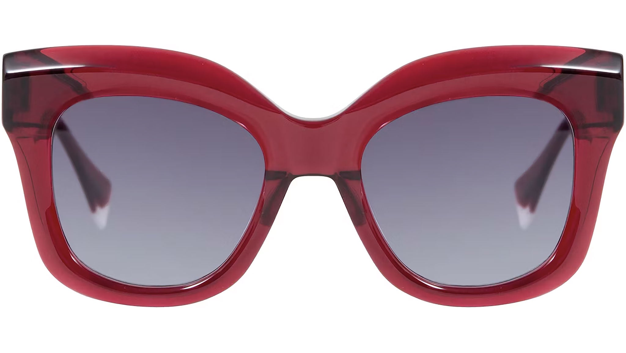 Occhiali da sole Gigi Studios modello 6774 Gilda codice colore 6 in rosso ciliegia. Un occhiale classico di forma butterfly full rim in acetato con lenti grigio. Il marchio garantisce la massima qualità costruttiva, grazie alla meticolosa selezione dei materiali, in collaborazione con i migliori fornitori italiani, tedeschi e giapponesi. Gigi Studios offre un'esperienza visiva eccezionale con lenti CR-39, confortevoli e sicure, che assorbono efficacemente i raggi UVA e UVB.