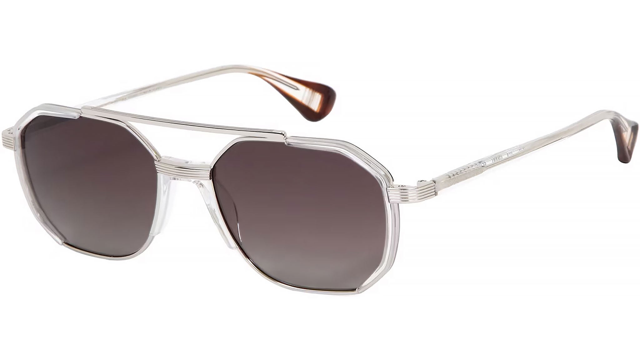 Occhiali da sole Gigi Studios modello 6670 Grant codice colore 8 in argento. Un occhiale classico di forma aviator full rim in acetato e metallo con lenti marrone sfumato. Il marchio garantisce la massima qualità costruttiva, grazie alla meticolosa selezione dei materiali, in collaborazione con i migliori fornitori italiani, tedeschi e giapponesi. Gigi Studios offre un'esperienza visiva eccezionale con lenti CR-39, confortevoli e sicure, che assorbono efficacemente i raggi UVA e UVB.