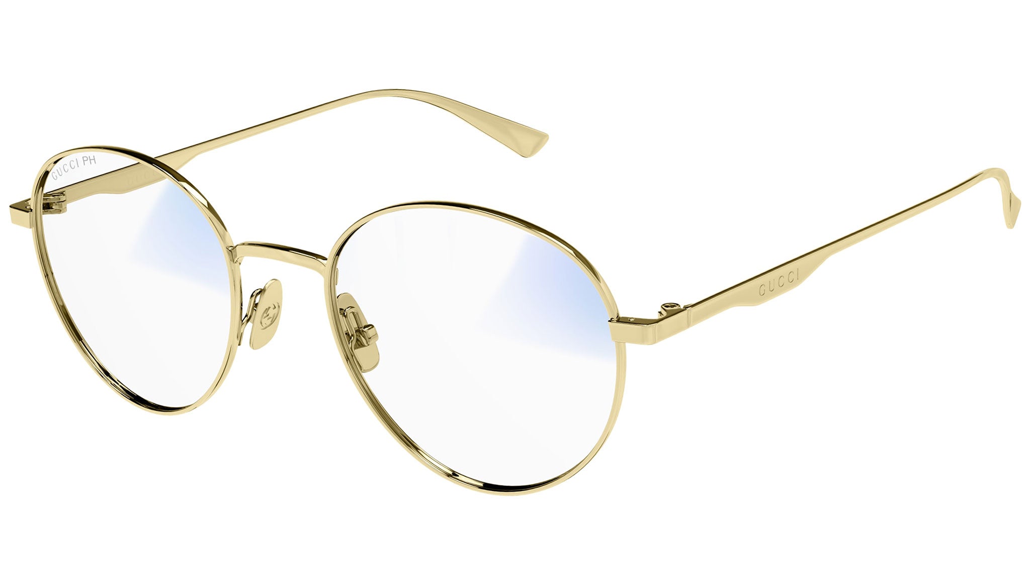 Occhiali da sole Gucci Logo modello GG0337S variante colore 001 oro endura lucido con lenti color beige trasparente fotocromatiche + riduzione luce blu.