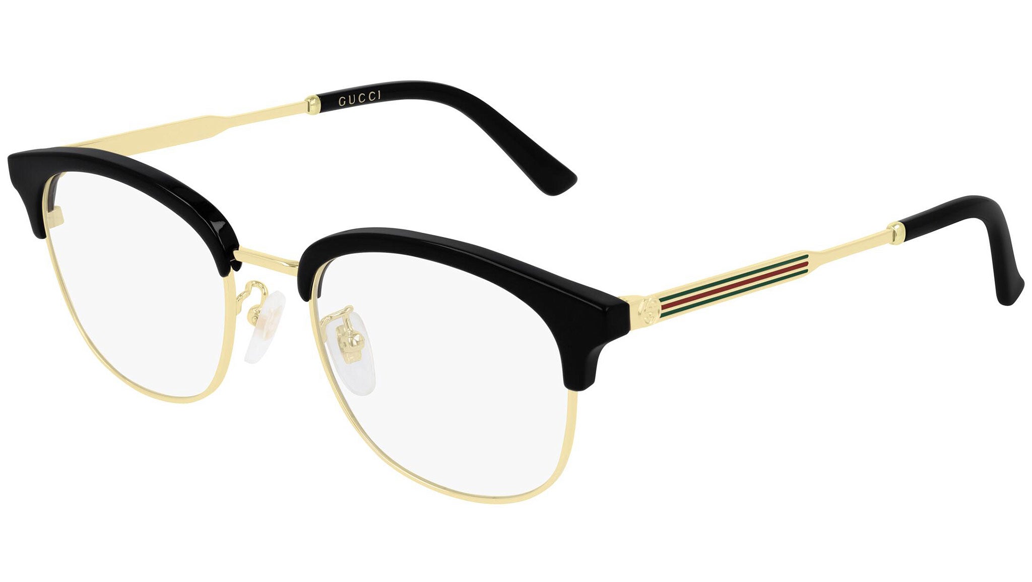 Gucci optical collection model GG0590OK 001 featuring shiny black / shiny endura gold frame and gold temple. Gucci Eyewear offer eclectic and contemporary creations that represent the pinnacle of Italian craftsmanship and are unsurpassed in quality, attention to detail and imaginative design. Buy your frames online and take them to your local optician to fit prescription lenses.