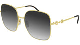 Occhiali da sole Gucci linea Gucci Logo modello GG0879S 001, variante colore oro endura lucido con lenti color grigio sfumato. Montature eclettiche e modelli intramontabili: la linea sole Gucci rappresenta la punta di diamante dell'artigianalità italiana. Massima qualità e attenzione ai dettagli, per un nuovo concetto di lusso: Gucci sta reinventando lo stile, con un approccio totalmente moderno alla moda, nella sua nuova vision più creativa, eclettica e audace.