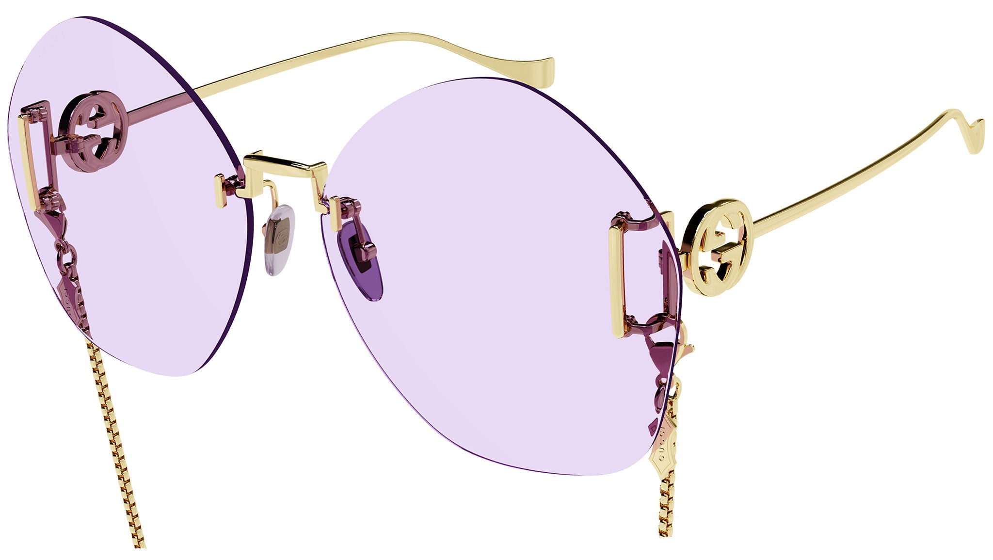 Occhiali da sole Gucci Logo modello GG1203S variante colore 001 oro endura lucido con lenti color lilla tinta unita.