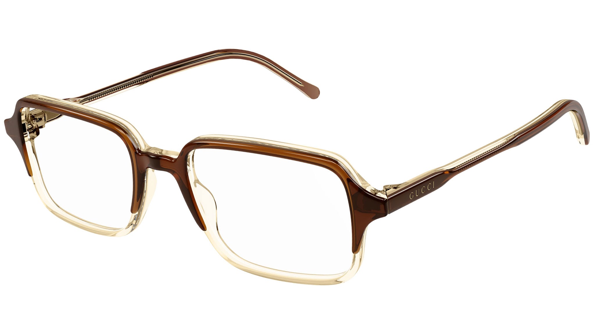 Occhiali da vista Gucci Logo modello GG1211O variante colore 003 bilayer marrone scuro / giallo chiaro con astine color marrone.
