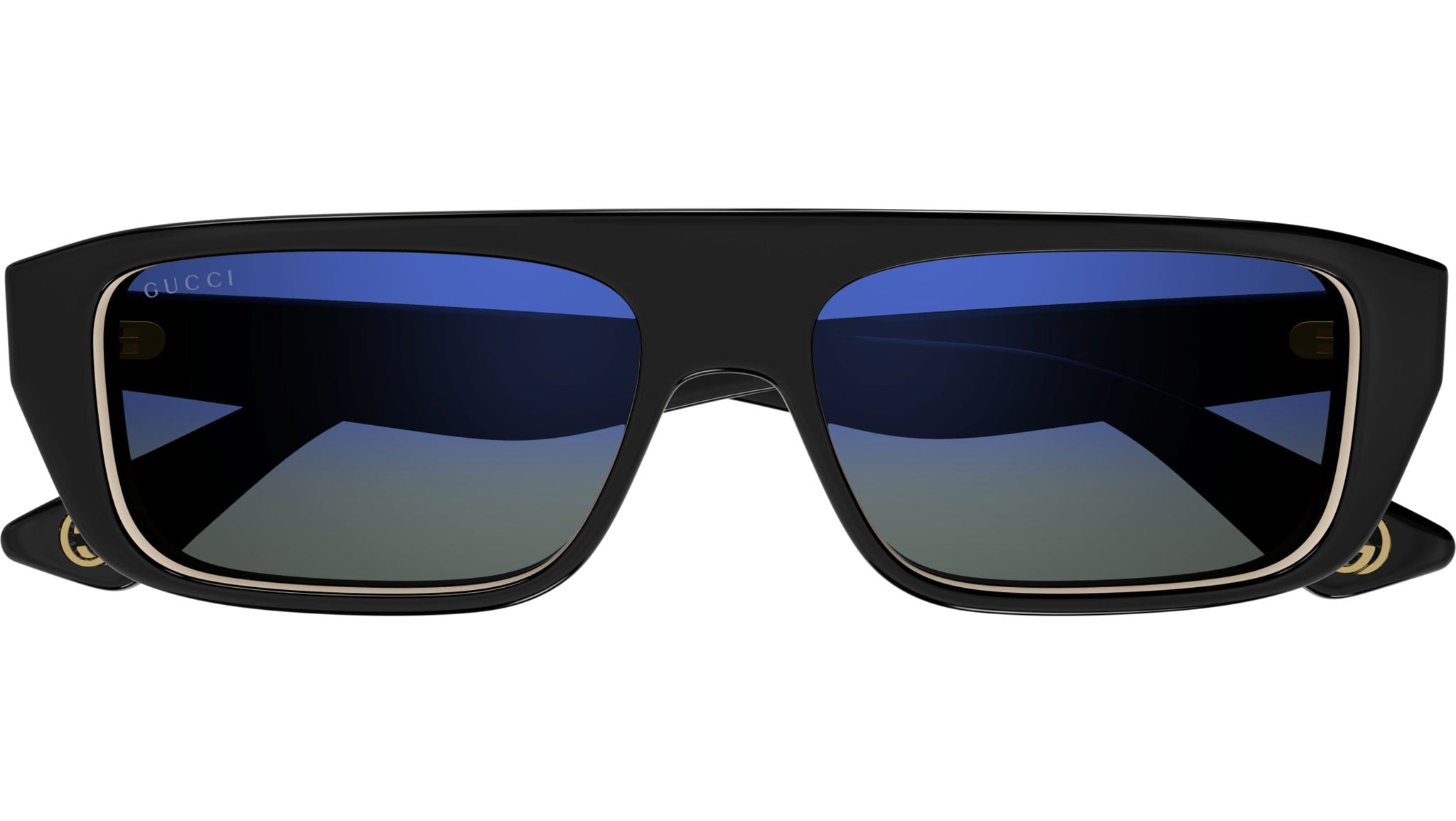 Occhiali da sole Gucci linea Lettering modello GG1617S rettangolari in acetato riciclato codice colore 003 doppio strato nero lucido tinta unita e avorio con aste nero e lenti color verde scuro solido + blu sfumato a specchio.