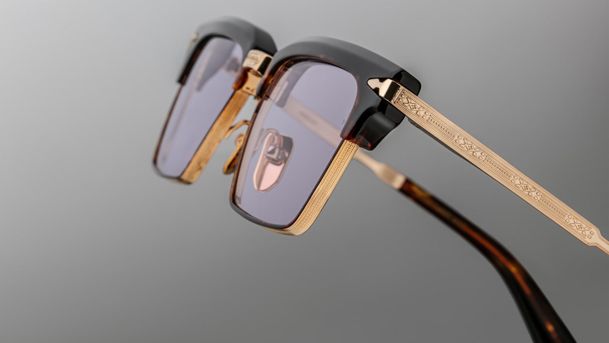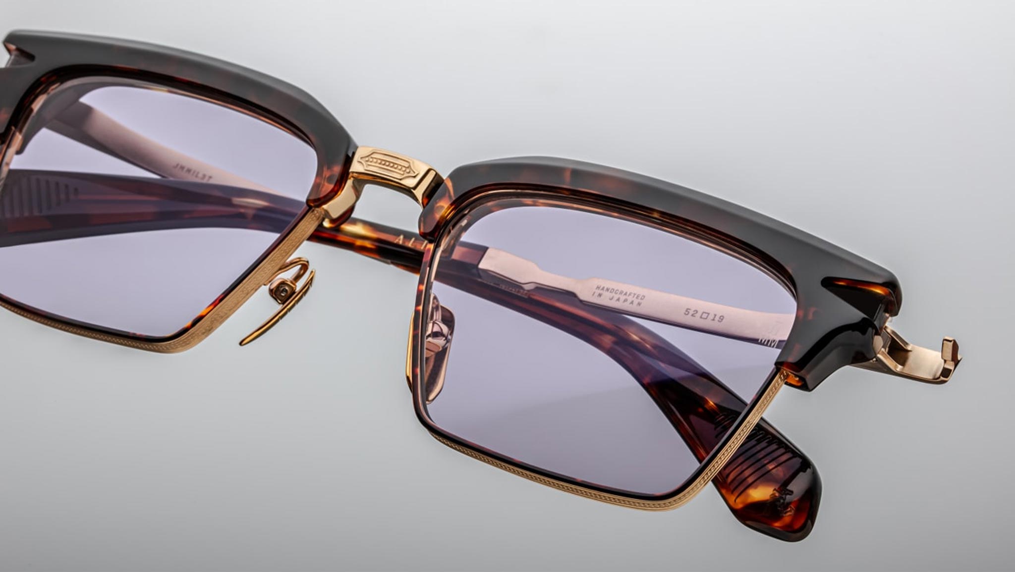 Light gold 100% beta titanium frame with light gold accents, Havana cured cellulose acetate, and lavender lenses. Features light gold engraved titanium temples with acetate tips, a light gold tension-secured custom arrowhead monoblock hinge, and Havana cellulose acetate custom nose pads with logo and hairline engraving. Lavender CR-39 4 base lenses with backside anti-reflective treatment ensure clarity and comfort. Frame shape: medium. Provides 100% UV protection.