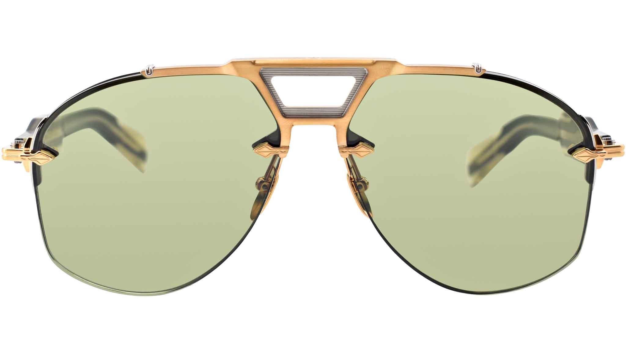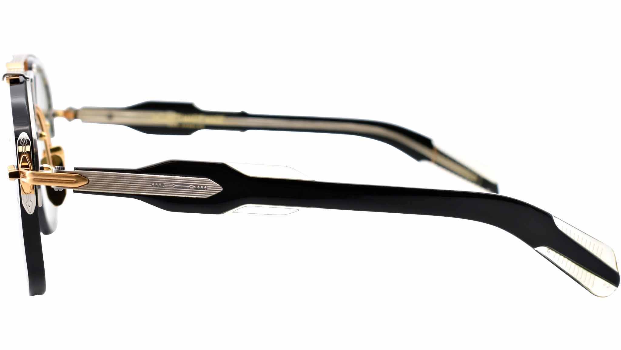 The Alta glasses features a gold 100% beta titanium frame with elegant silver accents, viper-patterned cured cellulose acetate temples, and grey lenses. The design is completed with a gold tension-secured custom block hinge and a gold bridge with silver highlights. Personalized with logo-engraved custom nose pads, the eyewear comes with vintage green 4mm CR-39 lenses, exclusive to JMM, and includes a 2 base lens with an anti-reflective coating for optimal clarity.