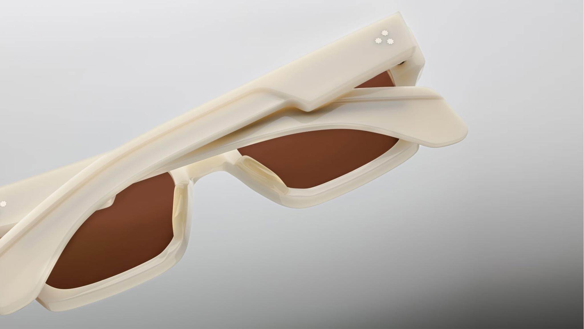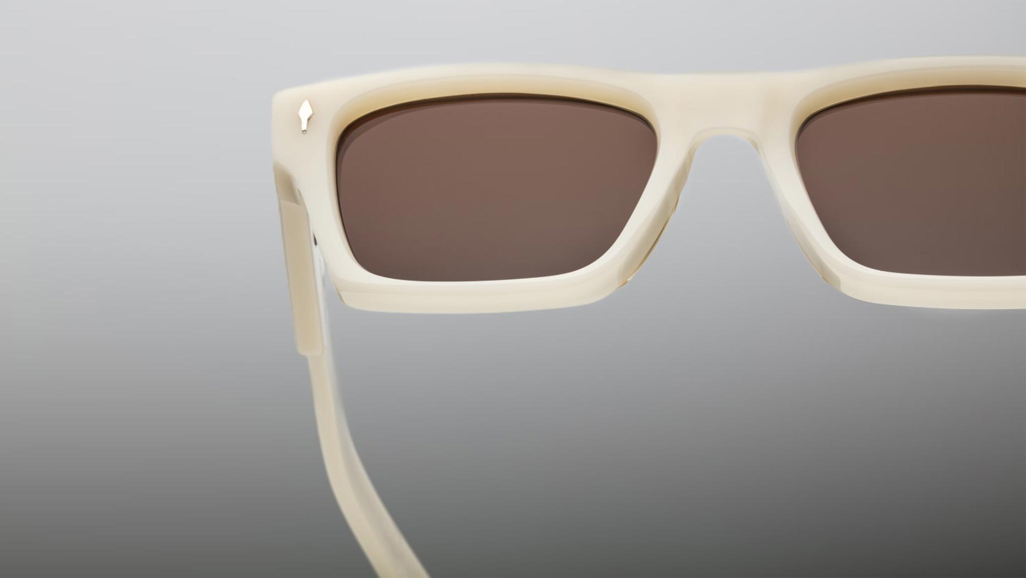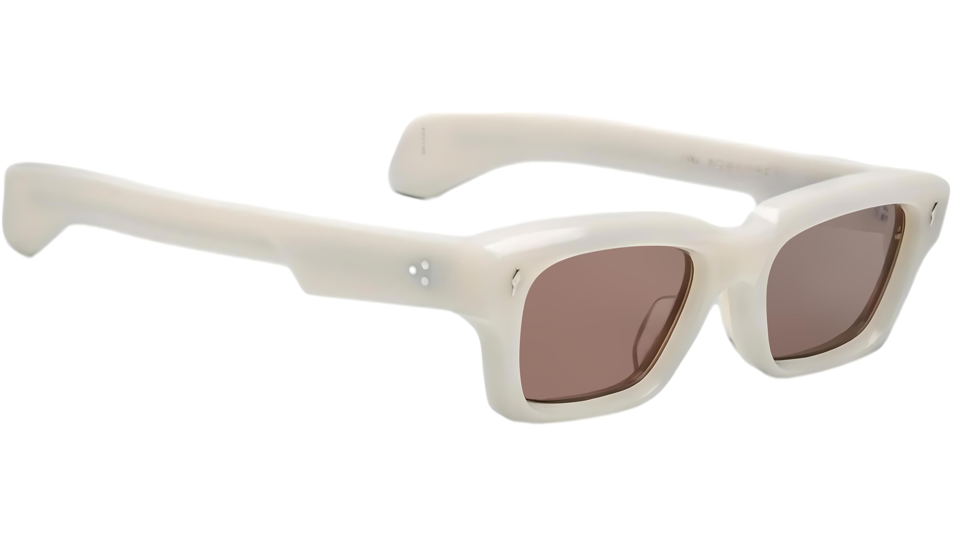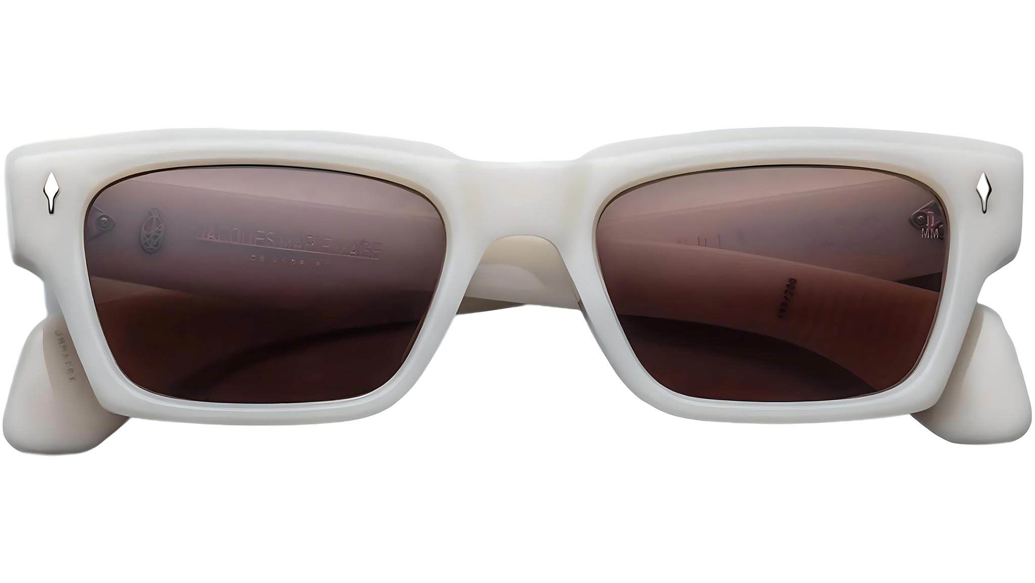 White 10mm cured cellulose acetate frame with custom double-laminated acetate temples featuring precious metal hardware and brown lenses. Includes a silver arrowhead front pin, hidden silver wire core with Native-inspired engraving, and a silver tension-secured custom 7-barrel hinge. Sweet brown CR-39 2 base lenses with backside anti-reflective treatment ensure clarity and comfort. Frame shape: rectangular. Provides 100% UV protection. Frame total width: mm.