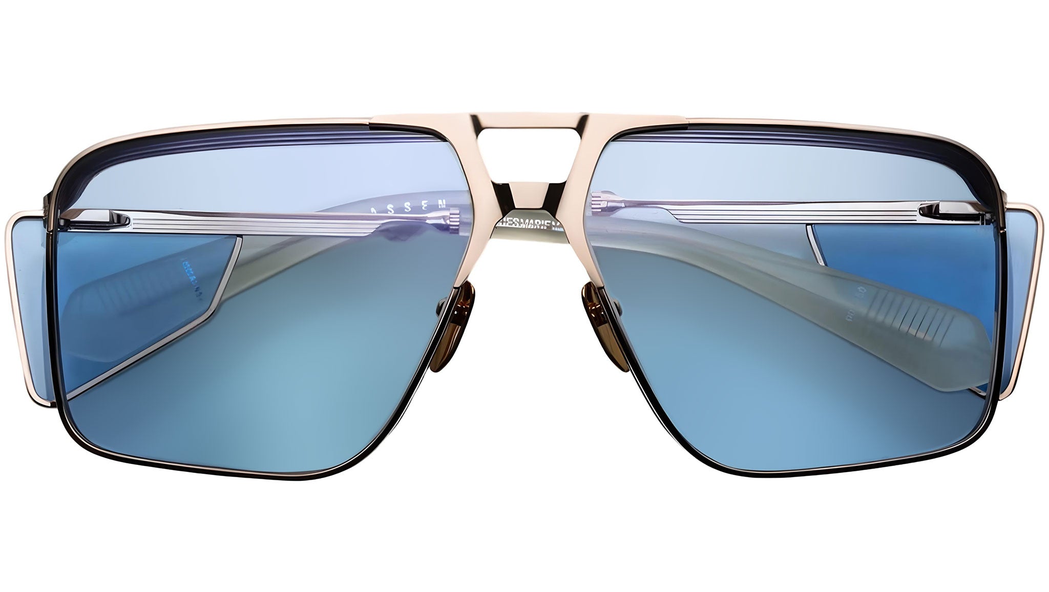 Jacques Marie Mage Altan: serious and sleek titanium navigators, handcrafted in Japan, featuring a bold double-bridge, new monoblock hinges, hairline engraved temples, lensed eyeshields, and acetate temple sleeves. Much like the Assen Circuit, known as "The Cathedral of Speed," where Valentino Rossi claimed a record ten victories, these handcrafted spectacles represent an important milestone on your path to victory, a meaningful sartorial achievement for all legends-in-the-making.
