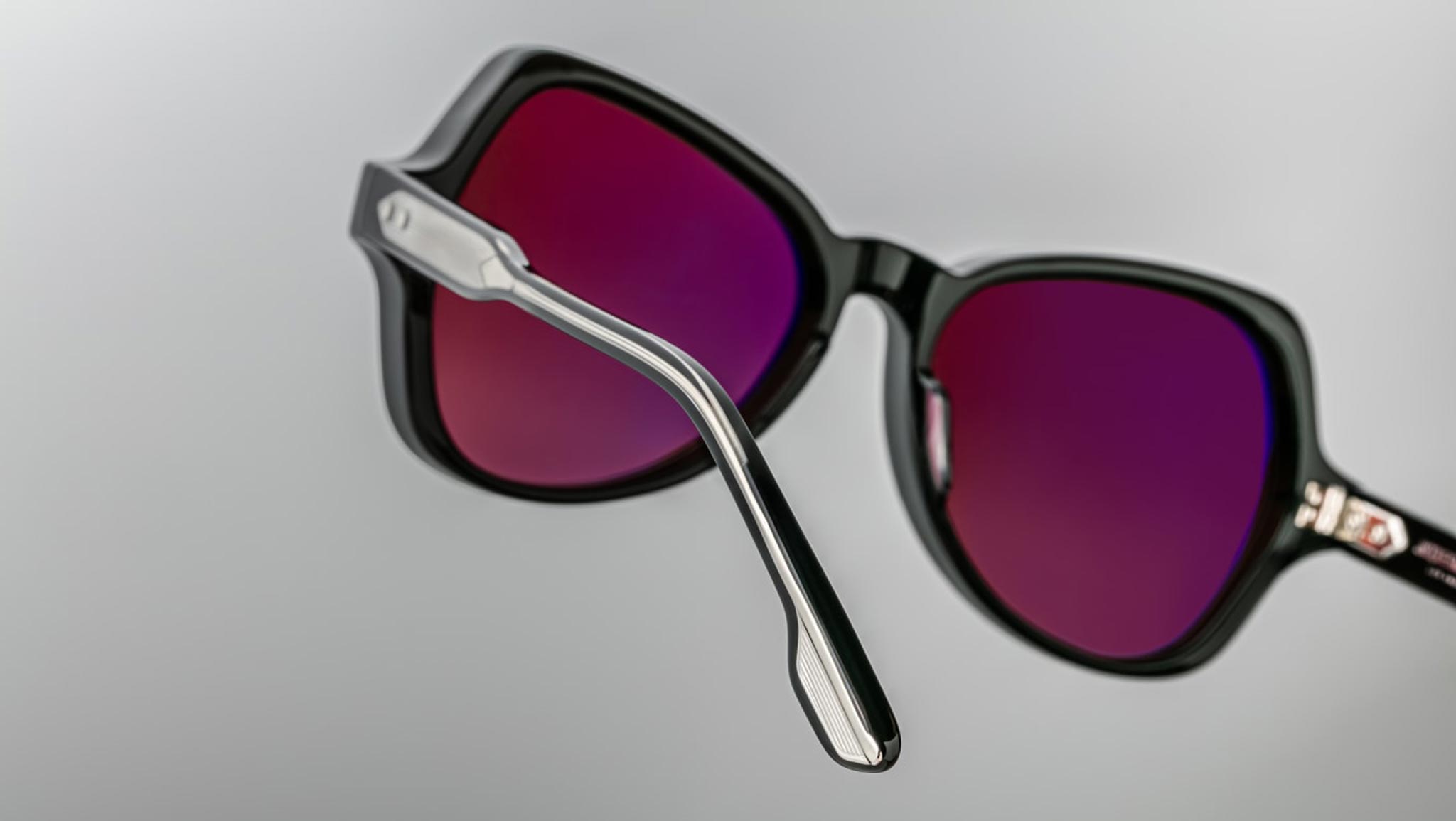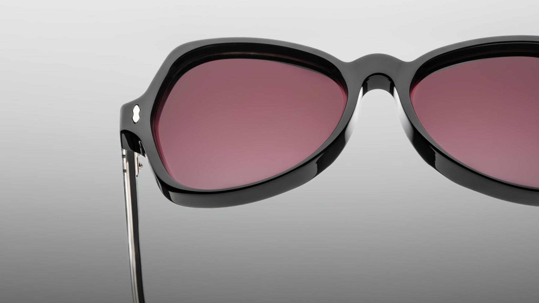 Black 10mm cured cellulose acetate frame with custom double-laminated acetate temples featuring sterling silver double arrowhead front pin and exposed silver Vauxhall wirecore. Includes a silver tension-secured custom 5-barrel hairline hinge and mahogany gradient CR39 4 base lenses with backside anti-reflective treatment. Provides 100% UV protection.