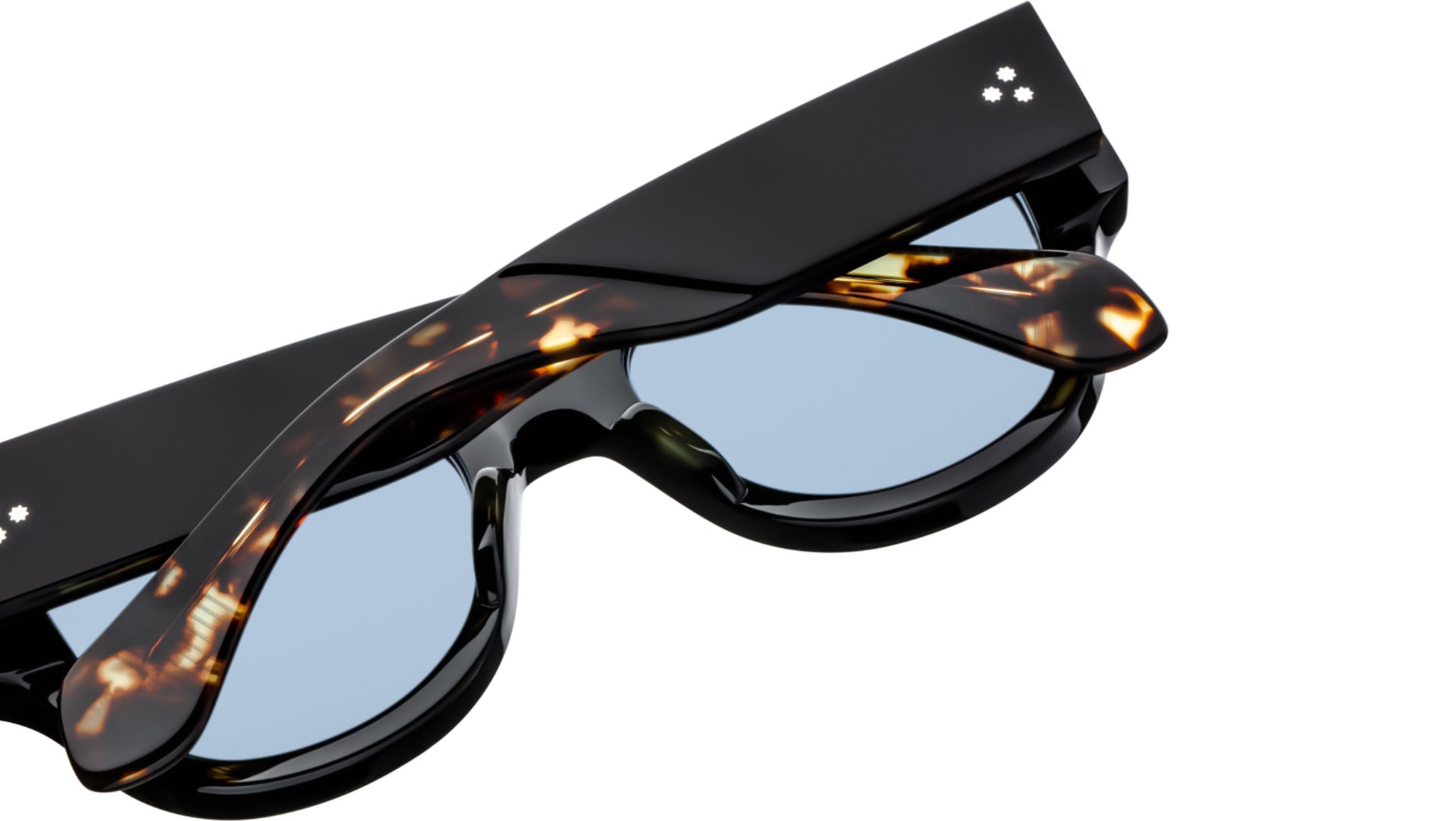 Black 10mm cured cellulose acetate frame with custom double-laminated acetate temples and sterling silver hardware. Features include a signature arrowhead front pin, silver cantilever wirecore, and tension-secured custom 7-barrel hairline hinge. Fitted with cerulean CR-39 4 base lenses with backside anti-reflective treatment for optimal clarity. Frame shape: medium. Provides 100% UV protection.