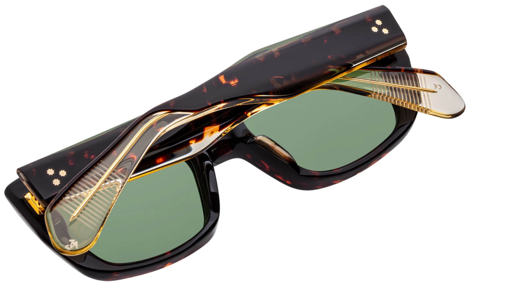 Havana 10mm cured cellulose acetate frame with custom double-laminated acetate temples featuring precious metal hardware and green lenses, dark gold signature arrowhead front pin, inner gold Classic wirecore, gold tension-secured custom 9-barrel hairline hinge, serpent CR-39 4-base lenses with backside anti-reflective treatment.