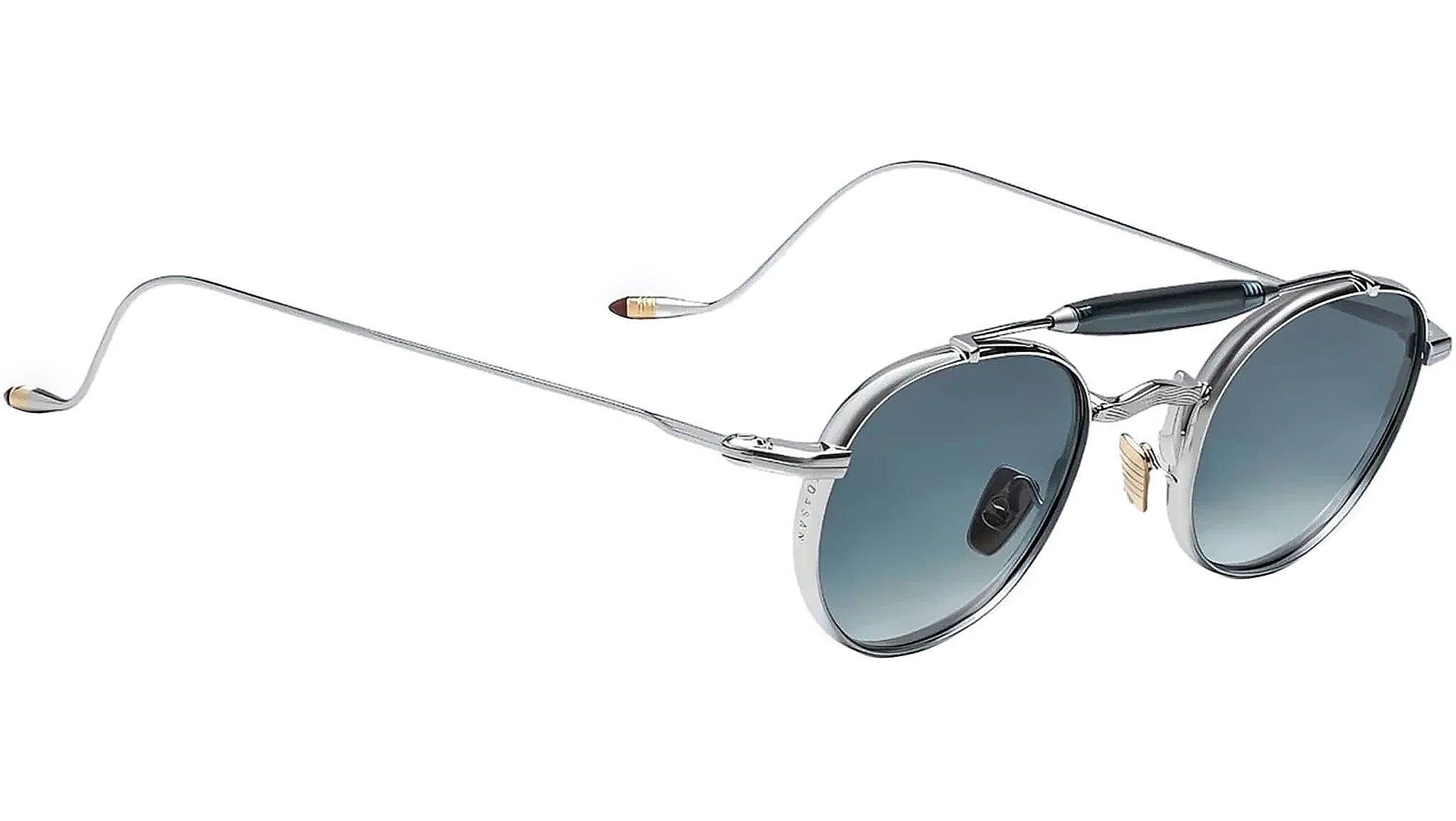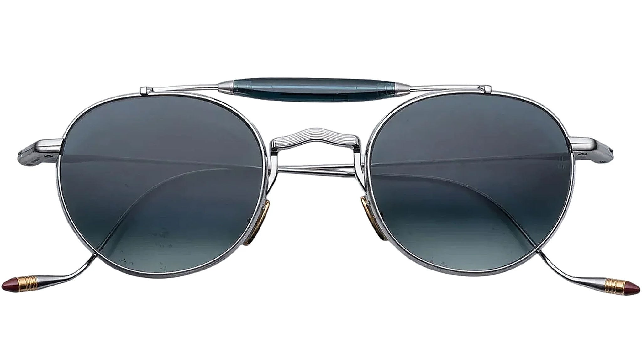 Silver 100% beta titanium frame with gold cured cellulose acetate bridge accent and green lenses. Silver titanium wire temples with gold epoxy tips. Silver tension-secured custom hairline block hinge. Silver acetate bridge accent. Custom nose pads with logo and hairline engraving. Blue CR-39 2-base lenses with backside anti-reflective treatment. Frame shape: round. 100% UV protection.