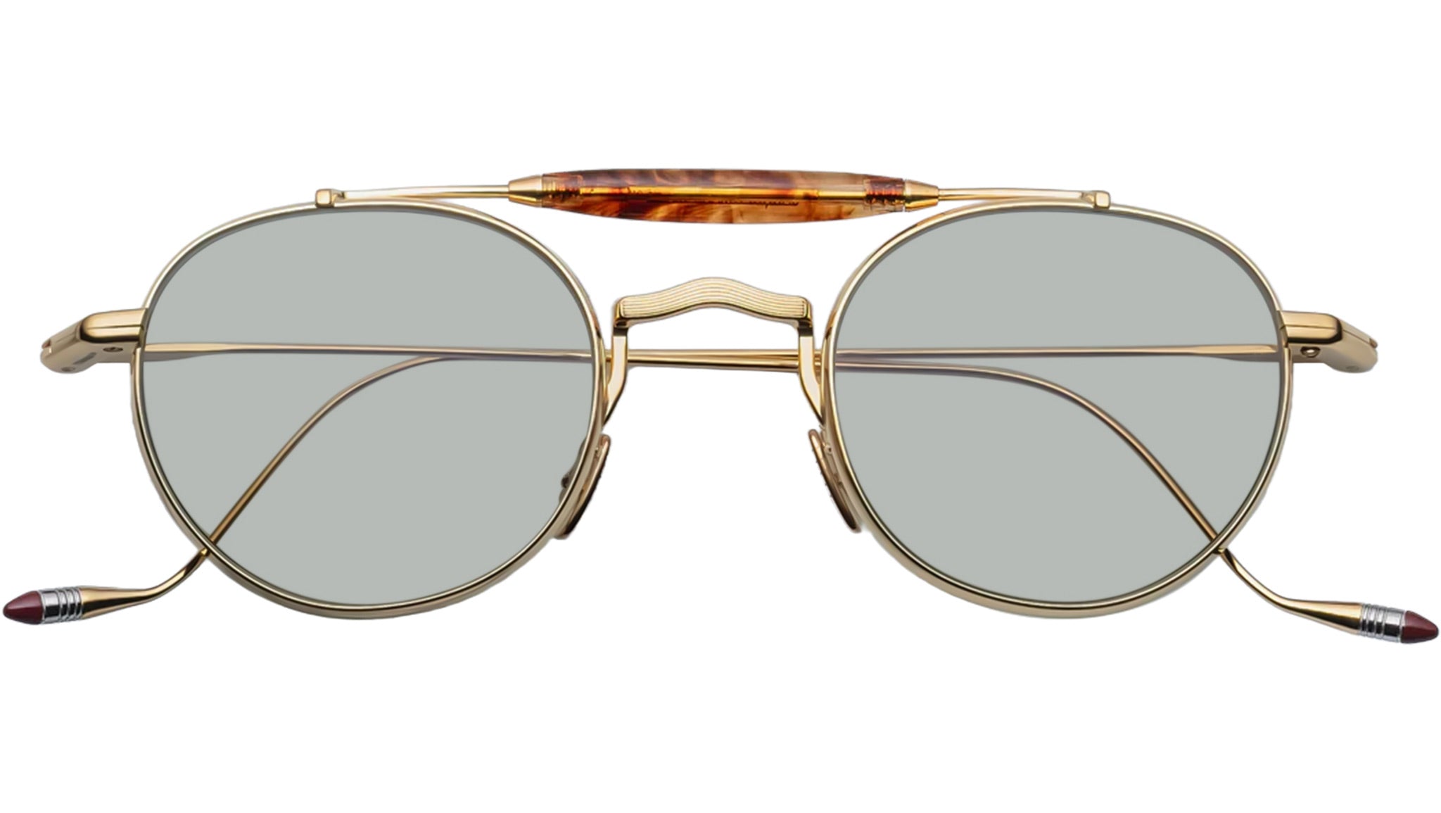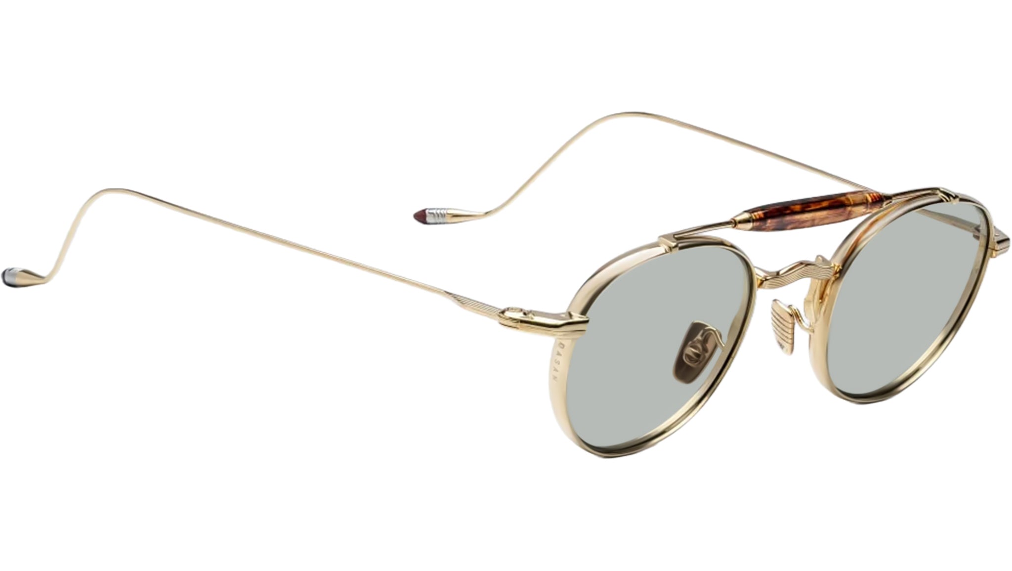 Gold 100% beta titanium frame with gold cured cellulose acetate bridge accent and green lenses. Gold titanium wire temples with gold epoxy tips. Gold tension-secured custom hairline block hinge. Gold acetate bridge accent. Custom nose pads with logo and hairline engraving. Green CR-39 2-base lenses with backside anti-reflective treatment. Frame shape: round. 100% UV protection.