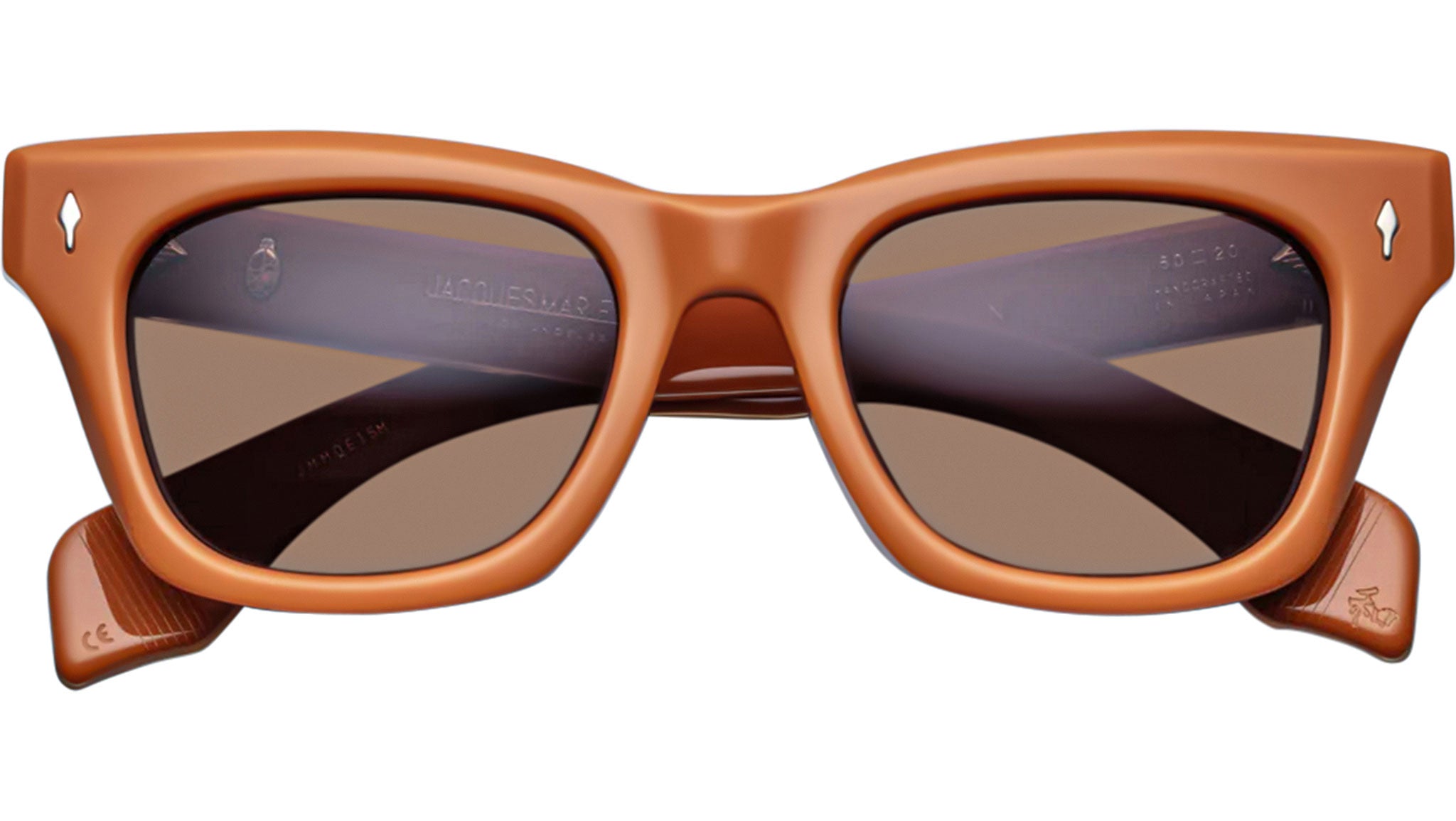 Orange 10mm cured cellulose acetate frame with custom double-laminated acetate temples and brown lenses. Features a silver arrowhead front pin, exposed silver wire core with custom hairline engraving, and a silver tension-secured custom 7-barrel hinge. Sienna CR-39 6 base lenses with backside anti-reflective treatment ensure clarity and comfort. Frame shape: square. Provides 100% UV protection.
