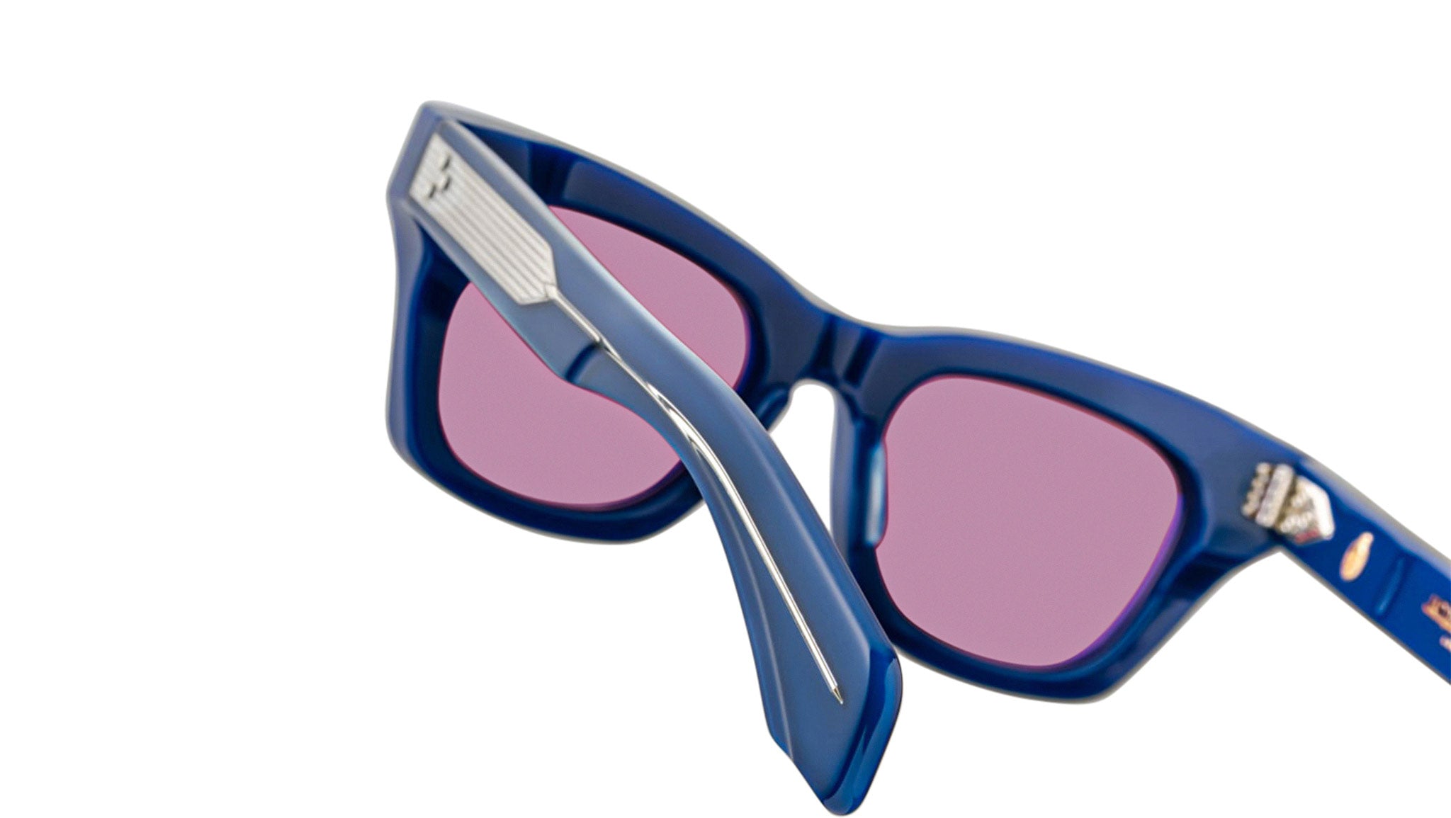 Blue 10mm cured cellulose acetate frame with custom double-laminated acetate temples and red lenses. Features a silver arrowhead front pin, exposed silver wire core with custom hairline engraving, and a silver tension-secured custom 7-barrel hinge. Mahogany CR-39 6 base lenses with backside anti-reflective treatment ensure clarity and comfort. Frame shape: square. Provides 100% UV protection.