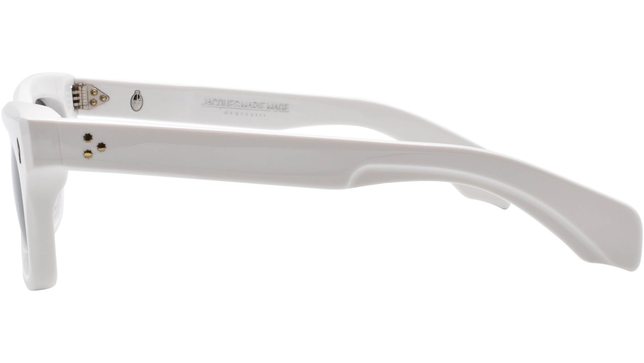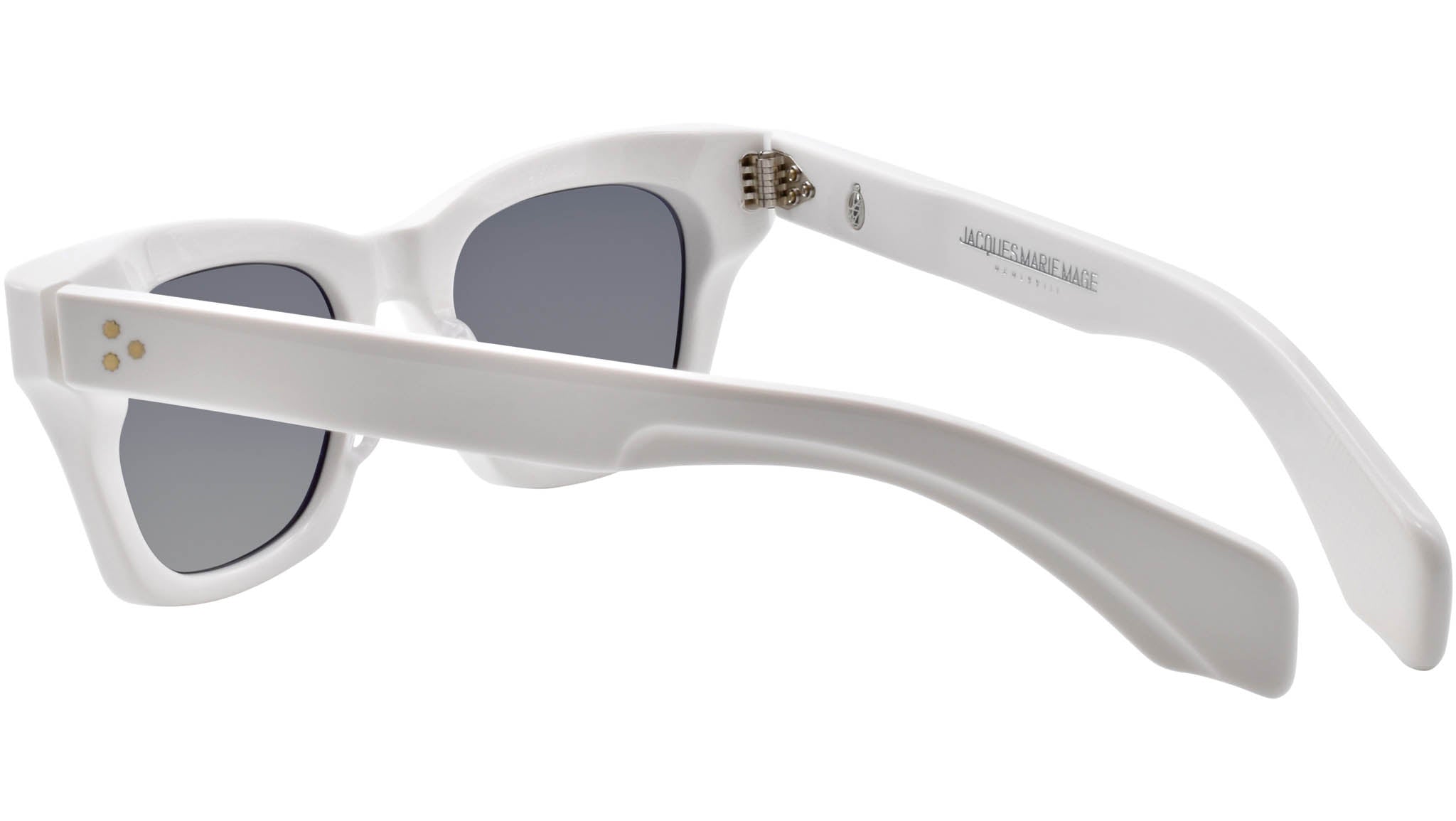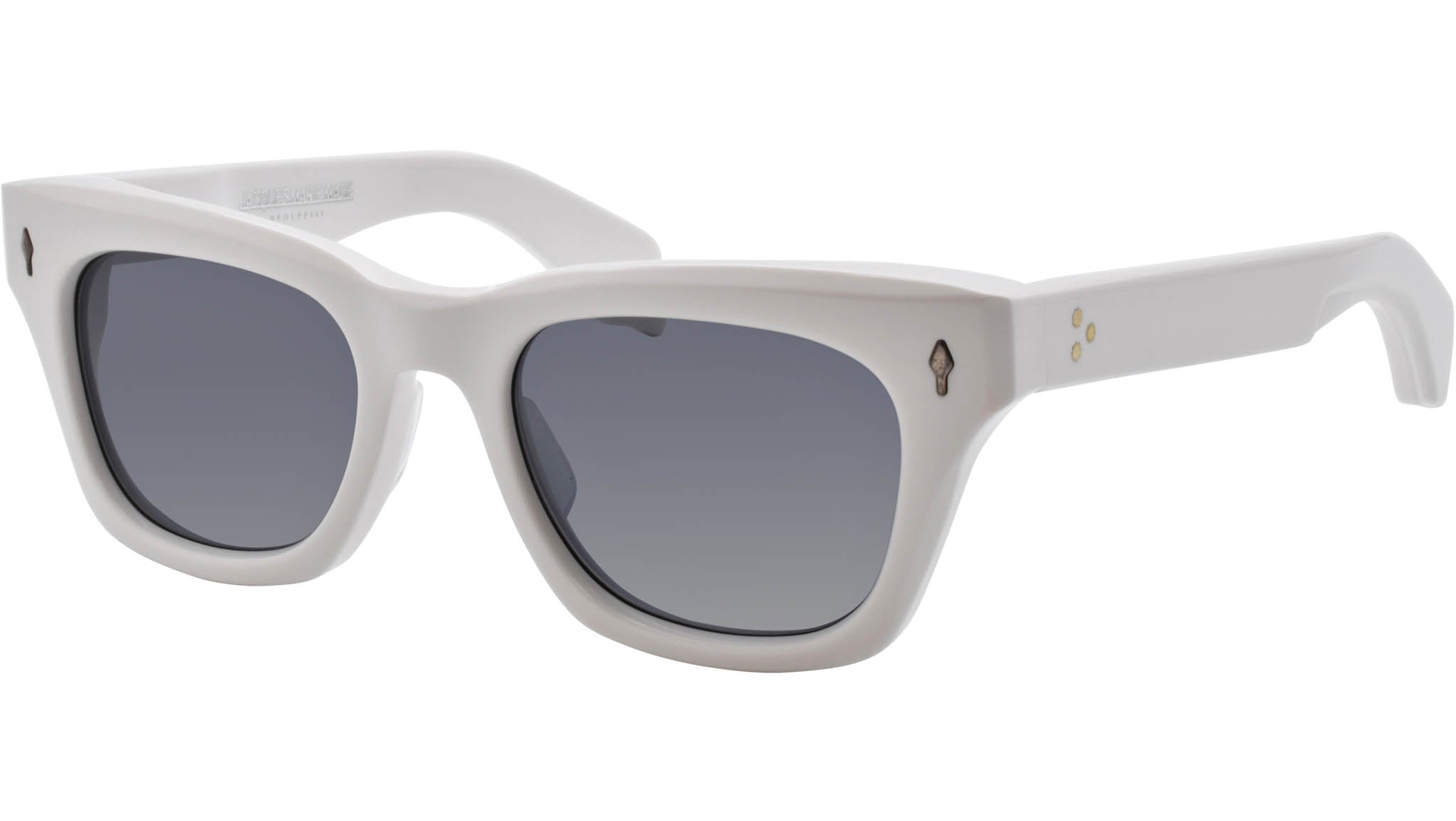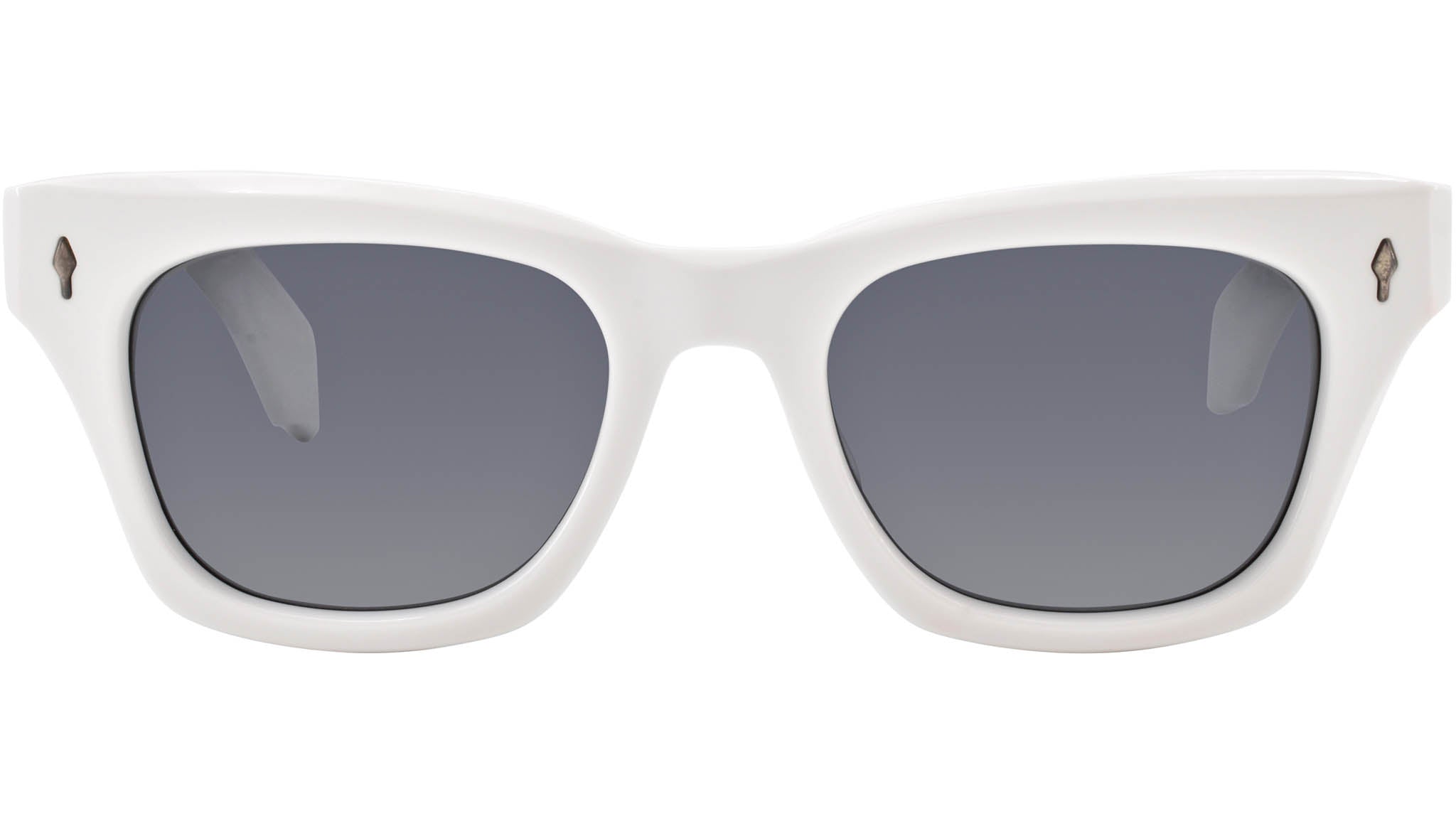 Subtle cat-eye, rectangular frame. White 10mm cured cellulose acetate frame and jet grey lenses. Silver signature arrowhead front pin. Exposed outer temple, silver custom hairline engraved wire core. Silver tension-secured custom 7-barrel hinge with silver spur-shaped rivets. Silver domed 3D metal cameo logo. Dark grey CR-39 lens 6 base lens with backside anti-reflective treatment. 100% UV protection.