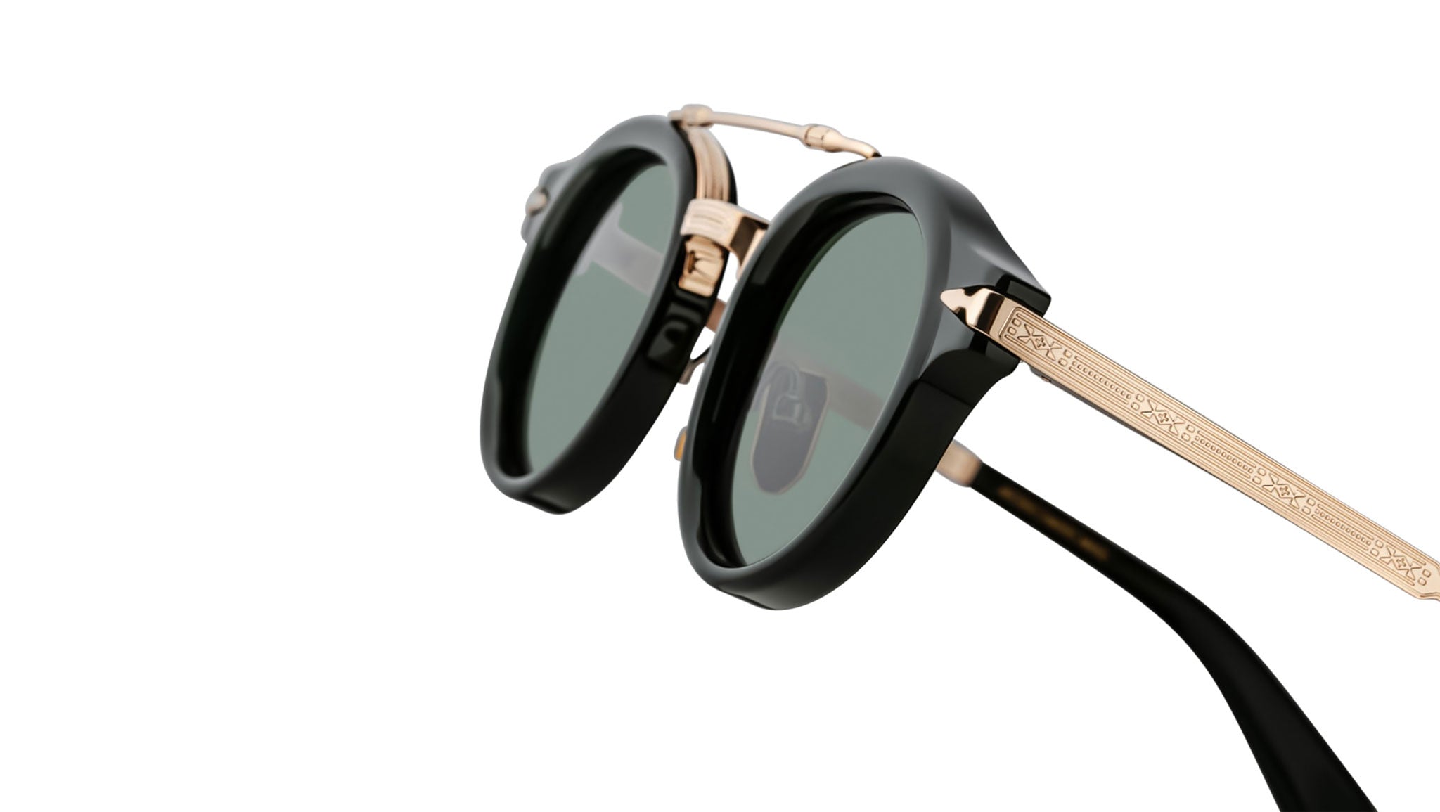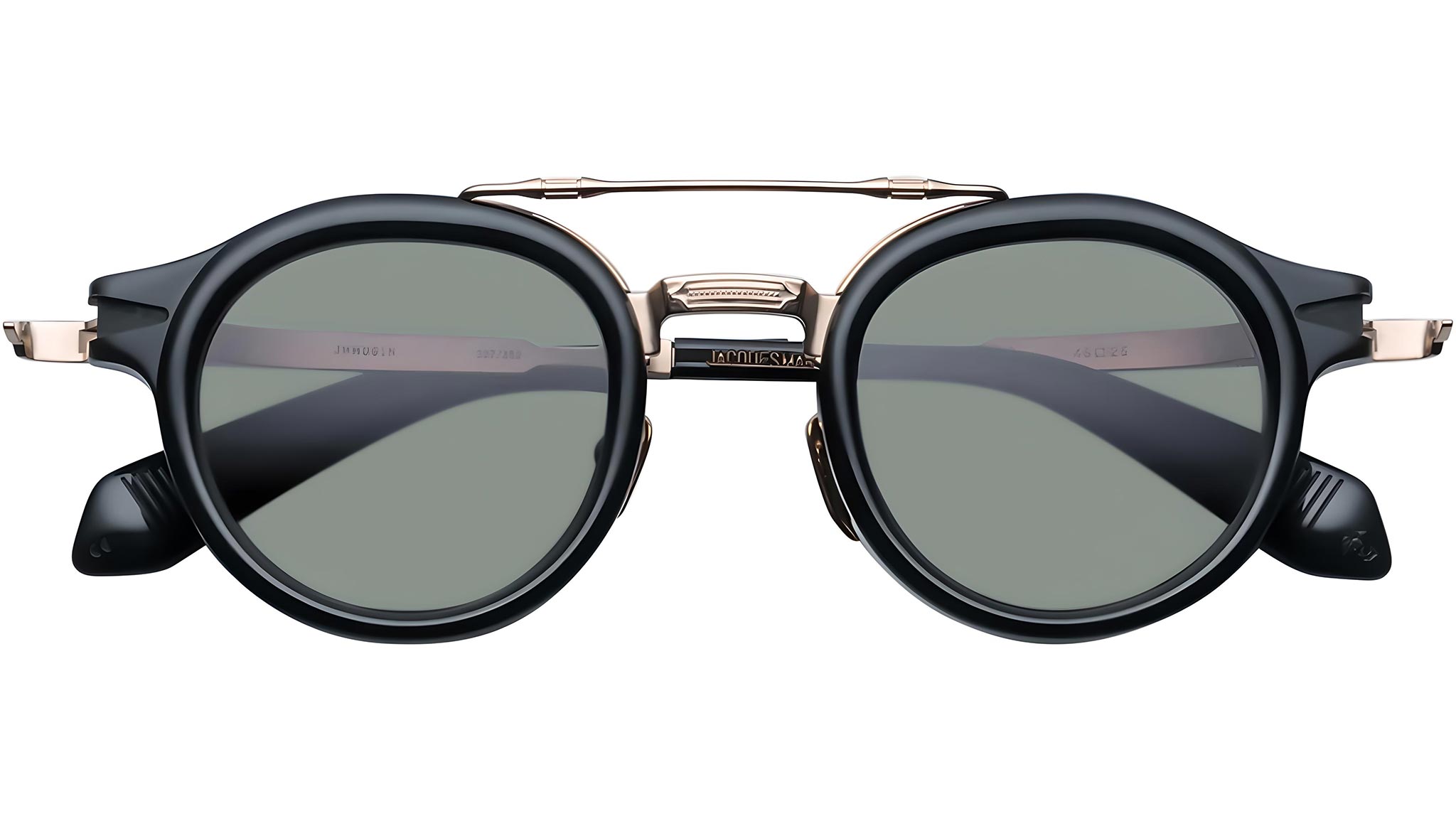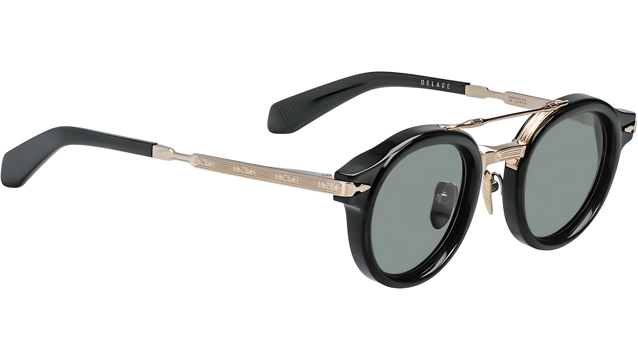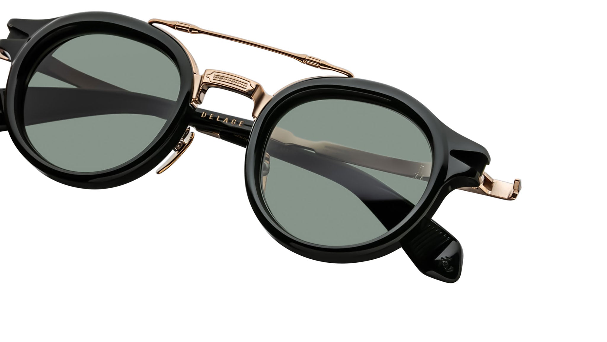 Gli occhiali Jacques Marie Mage Delage reinterpretano con eleganza le montature combinate anni '50, unendo forme circolari in acetato a un raffinato ponte in titanio. Caratterizzati da aste incise, cerniere monoblocco a freccia e dettagli ispirati all'Art Déco, combinano eleganza senza tempo e modernità. Montatura in titanio oro chiaro con dettagli in acetato nero e lenti CR-39 verdi Pine con trattamento antiriflesso e protezione UV 100%. Presentati in un cofanetto in seta con custodia in pelle rigida e certificato numerato. Edizione limitata di 350 pezzi. Codice modello: JMMDG-1N.