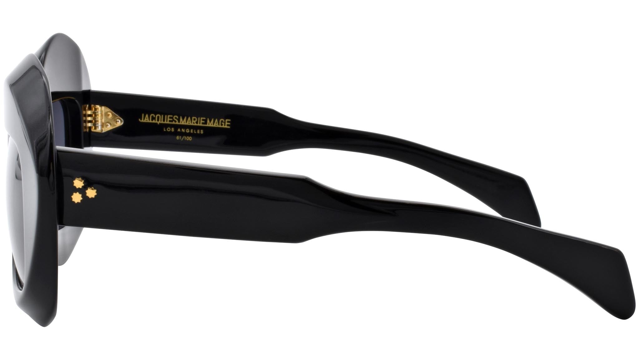 The Doll features a black 8mm cured cellulose acetate frame, accentuated by custom acetate temples with precious metal hardware. The black lenses exude sophistication and mystery. The dark gold wire core showcases custom filigree engraving, while the dark gold tension-secured custom 7-barrel hinge ensures durability. The Jet CR-39 6 base lenses, enhanced with backside anti-reflective treatment, deliver optimal visual clarity.