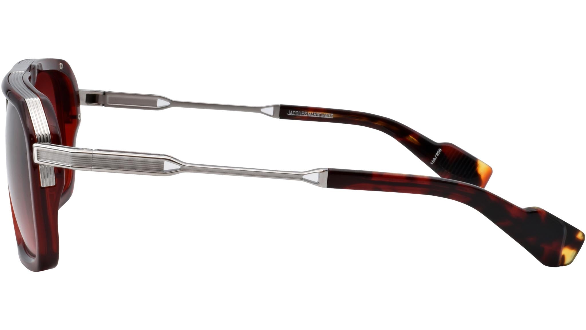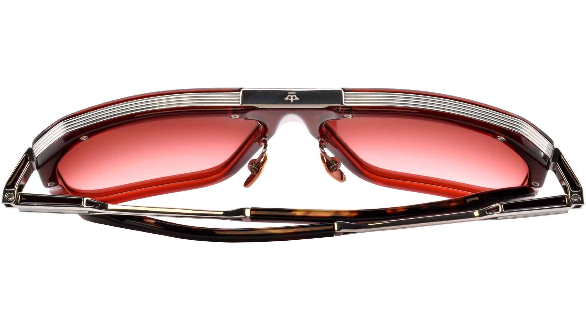 Bold and boxy acetate frame with streamlined titanium temples and brow bar. Ideal for faces that need a more generous fit. Red 9mm cured cellulose acetate front with combo temples featuring double laminated temple tips and red gradient lenses. Burgundy acetate front. Silver titanium temples with black epoxy detailing and black acetate temple tips. Silver tension-secured custom le mans hinge. Custom silver nose pads with logo and hairline engraving. 6 base rose gradient lens with backside anti-reflective treatment. 100% UV protection.