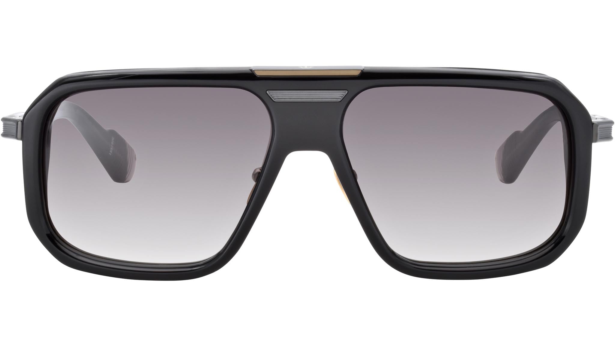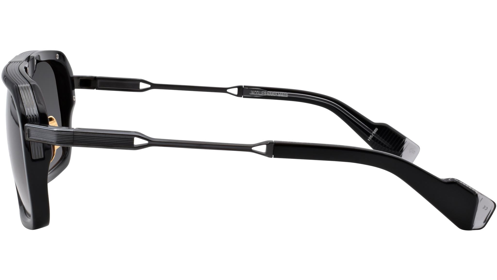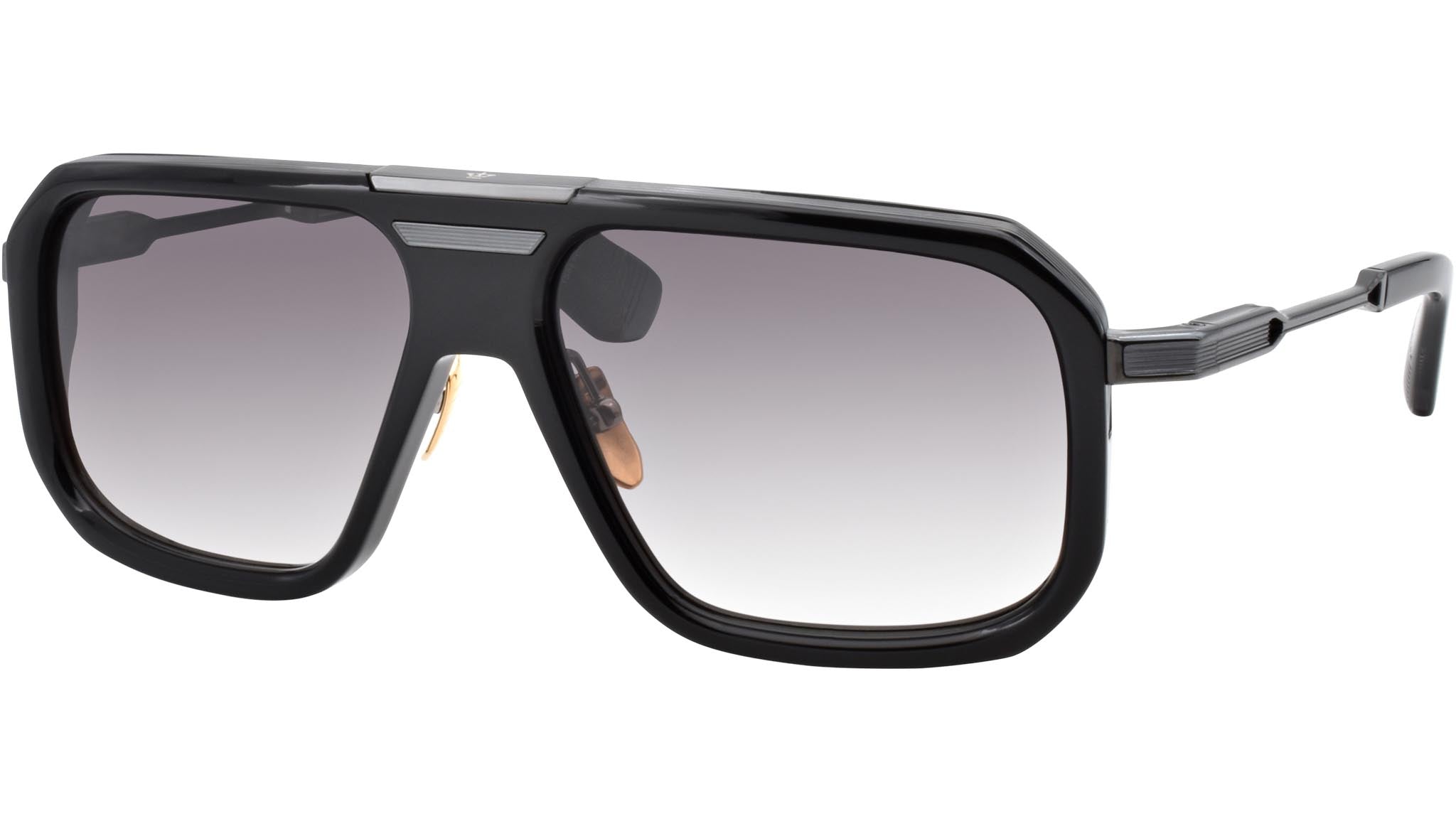 Bold and boxy acetate frame with streamlined titanium temples and brow bar. Ideal for faces that need a more generous fit. Black 9mm cured cellulose acetate front with combo temples featuring double laminated temple tips and black gradient lenses. Black acetate front. Matte black titanium temples with black epoxy detailing and black acetate temple tips. Matte black tension-secured custom le mans hinge. Custom matte black nose pads with logo and hairline engraving. 6 base crescent gradient lens with backside anti-reflective treatment. 100% UV protection.