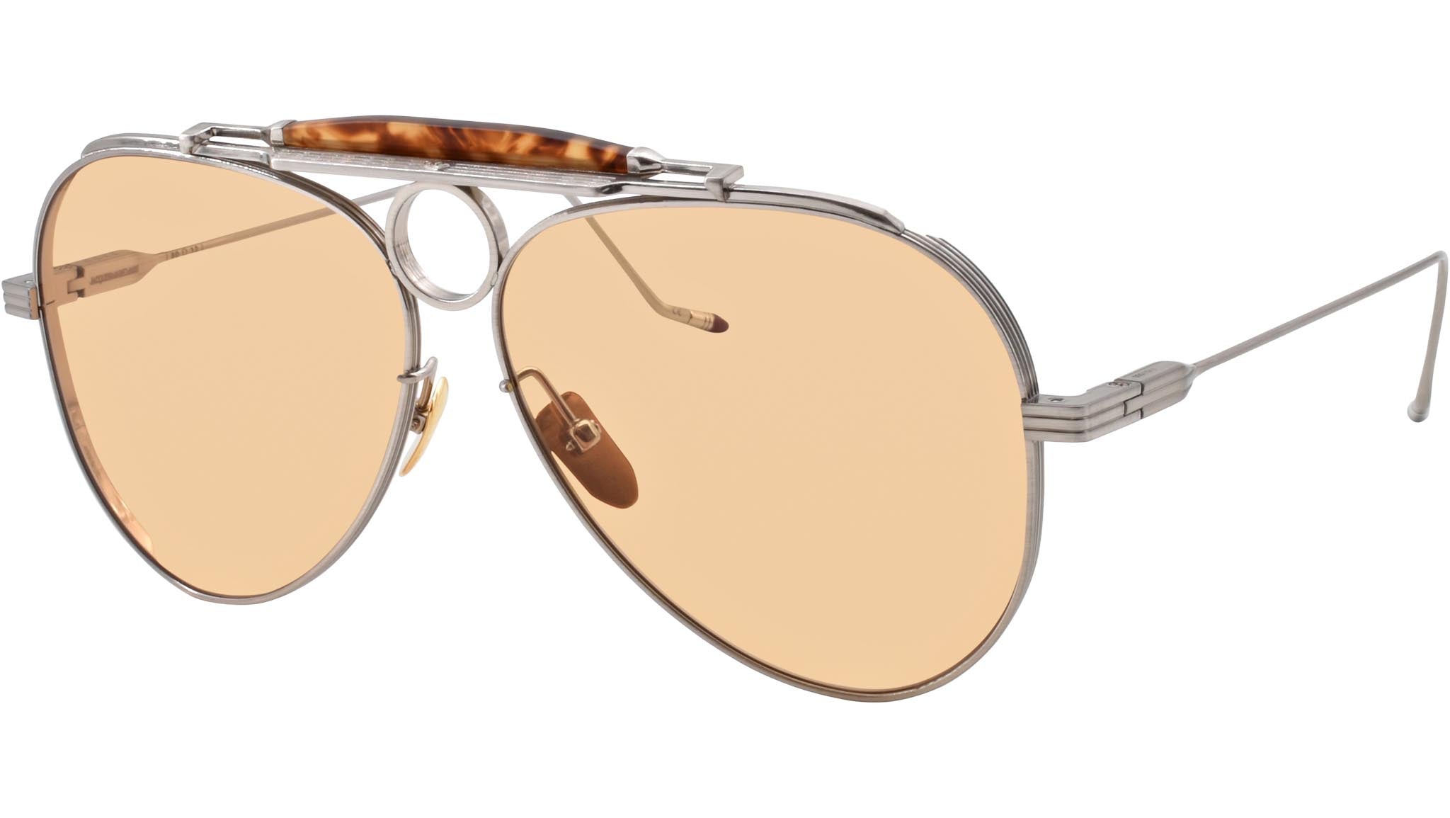 The Silver 100% beta titanium frame is accentuated with havana-cured cellulose acetate and yellow lenses, resulting in a striking combination. The glasses boast a custom silver block hinge and an argyle acetate bridge accent. The burgundy epoxy tail-fin temple tips adds a touch of sophistication. Custom nose pads featuring the logo and intricate hairline engraving ensure a comfortable fit. The 2 base yellow CR-39 lenses are enhanced with backside anti-reflective treatment, providing both style and functionality.