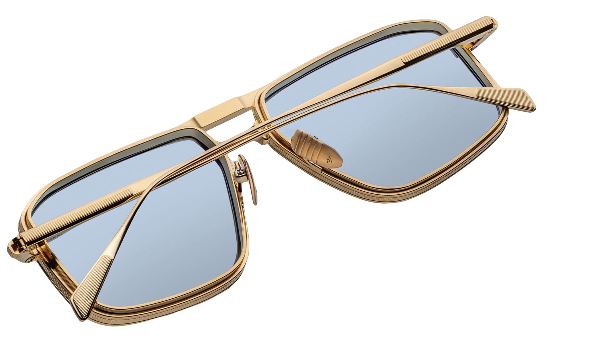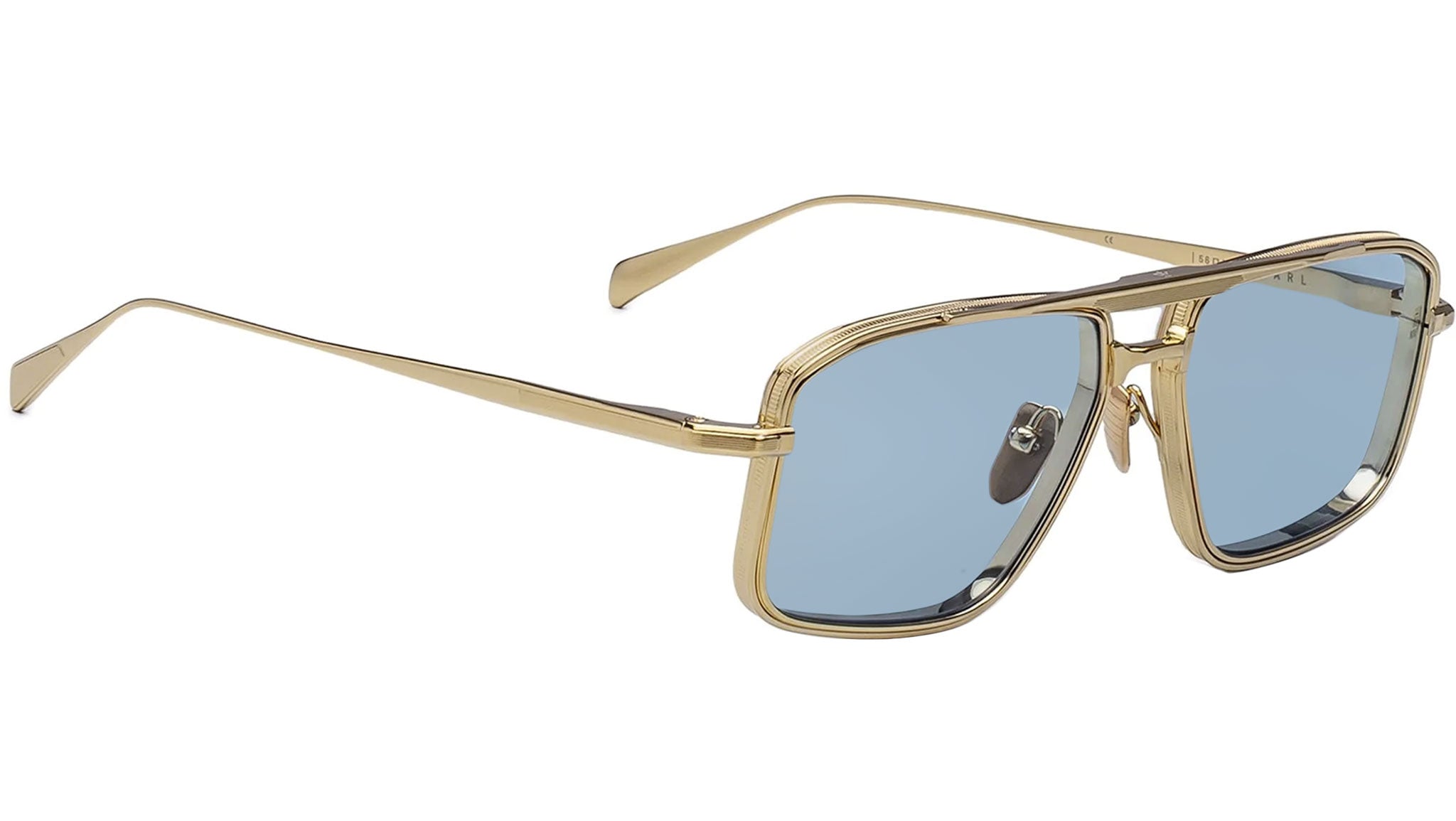 Gold 100% beta titanium frame paired with blue lenses, featuring a custom gold bone hinge and custom nose pads with logo and hairline engraving. Fitted with baby blue CR-39 2 base lenses, finished with backside anti-reflective treatment.