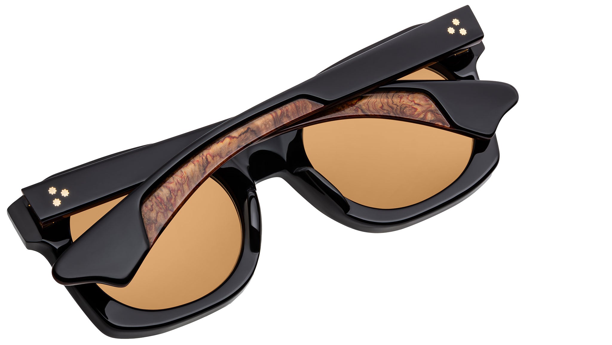 Black 10mm cured cellulose acetate frame with custom double-laminated acetate temples featuring precious metal hardware, dark gold-finished signature arrowhead front pins, hidden dark gold-finished 'Classic' wirecores, custom stainless steel 7-barrel hinges finished in dark gold with Art Deco hairline details, orange Armorlite 4-base lenses with backside anti-reflective treatment.