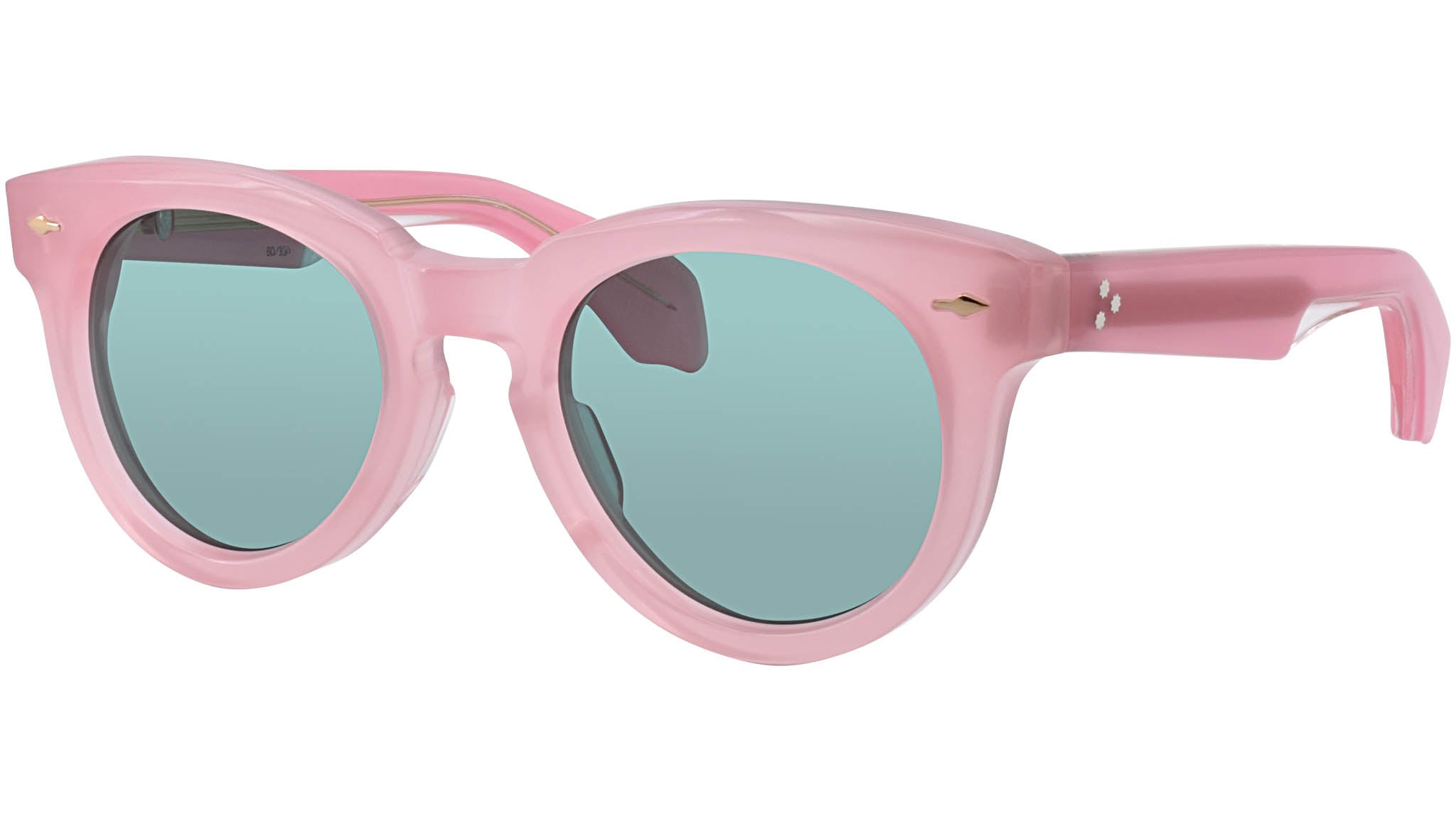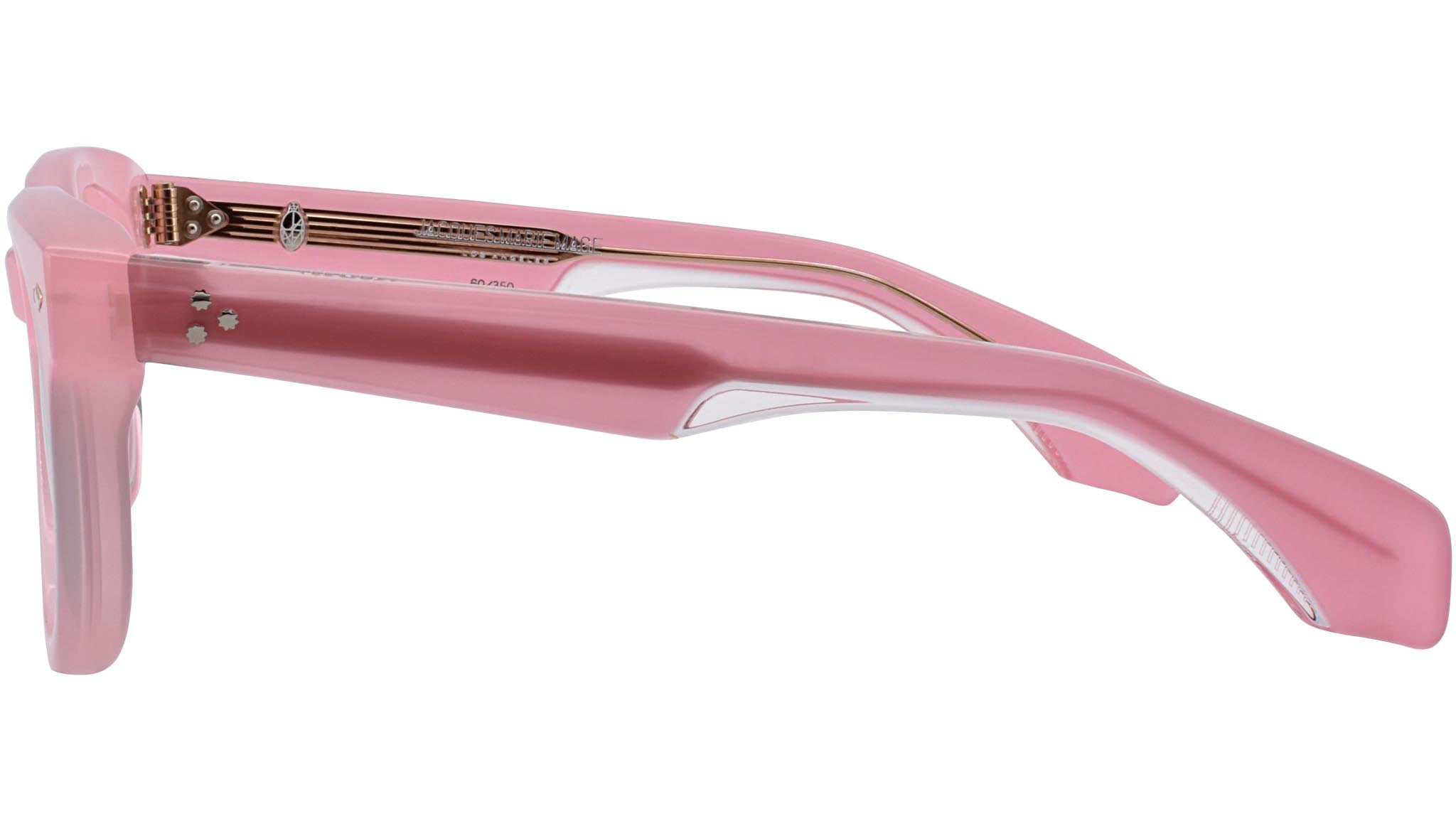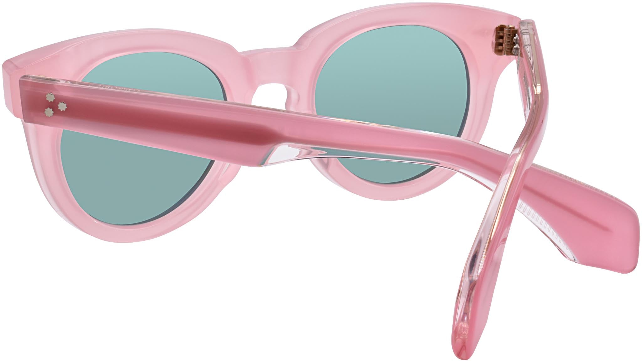 The return of an original style from our debut season--well-balanced, unisex glasses with a modified Panto shape, keyhole nose design, and exposed wirecore temples with signature embellishments. Pink 10mm cured cellulose acetate frame with custom double laminated temples featuring precious metal hardware and green lenses. Light gold arrowhead front pin. Hidden light gold wirecore with custom hairline engraving. Light gold tension-secured custom 7 barrel hinge. Seagreen CR-39 4 base lens with backside anti-reflective treatment. 100% UV protection.