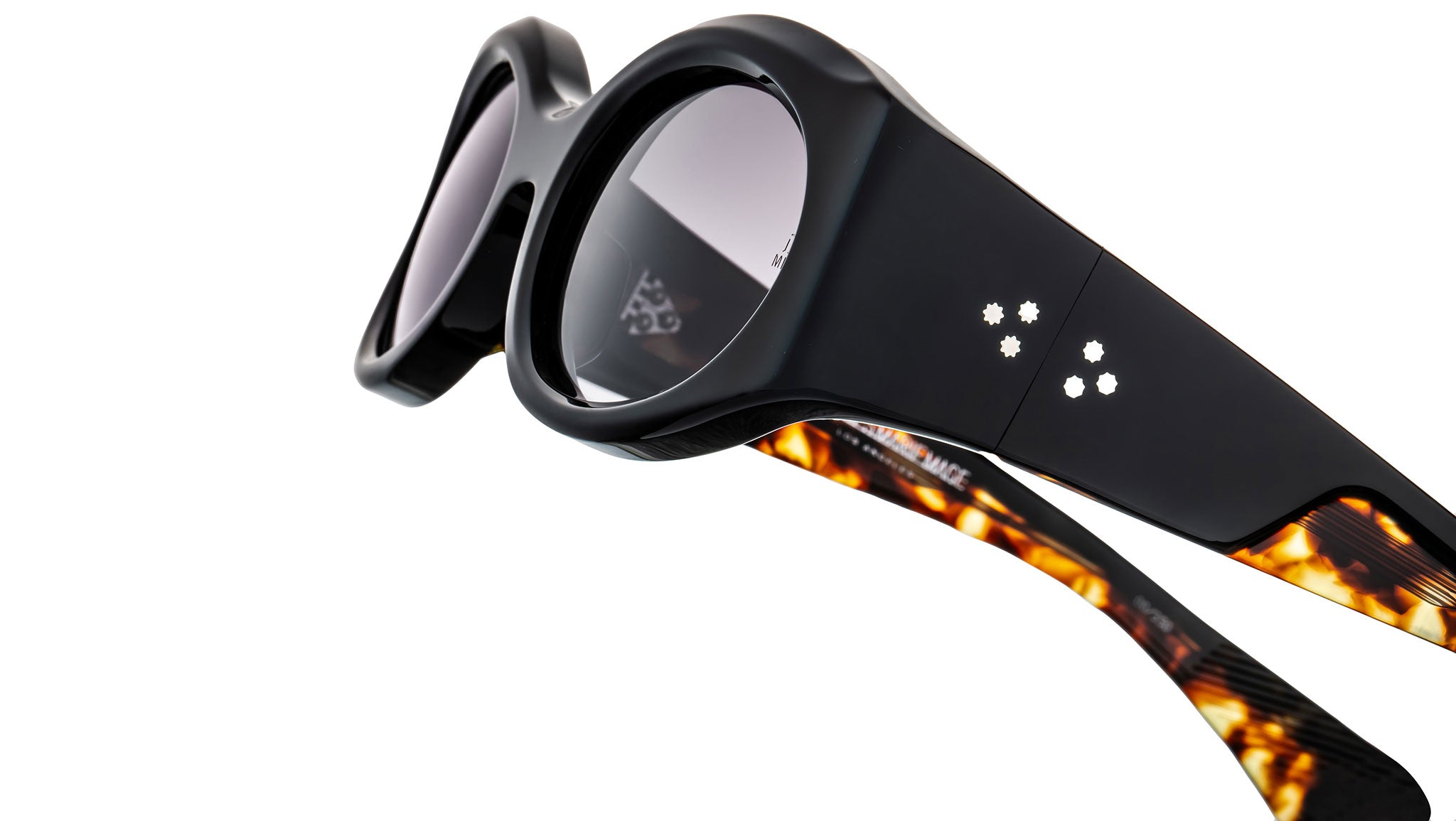 10mm cured cellulose acetate frame in black with custom double-laminated temples composed of black exteriors and Havana interiors, complemented by Armorlite 6-base lenses in jet gradient with backside anti-reflective treatment, hidden Ottertail wirecores plated in silver palladium, custom 7-barrel hinges with refined hairline details plated in silver palladium, spur-shaped rivets plated in silver palladium, inner-temple hallmarks foil-stamped in silver.