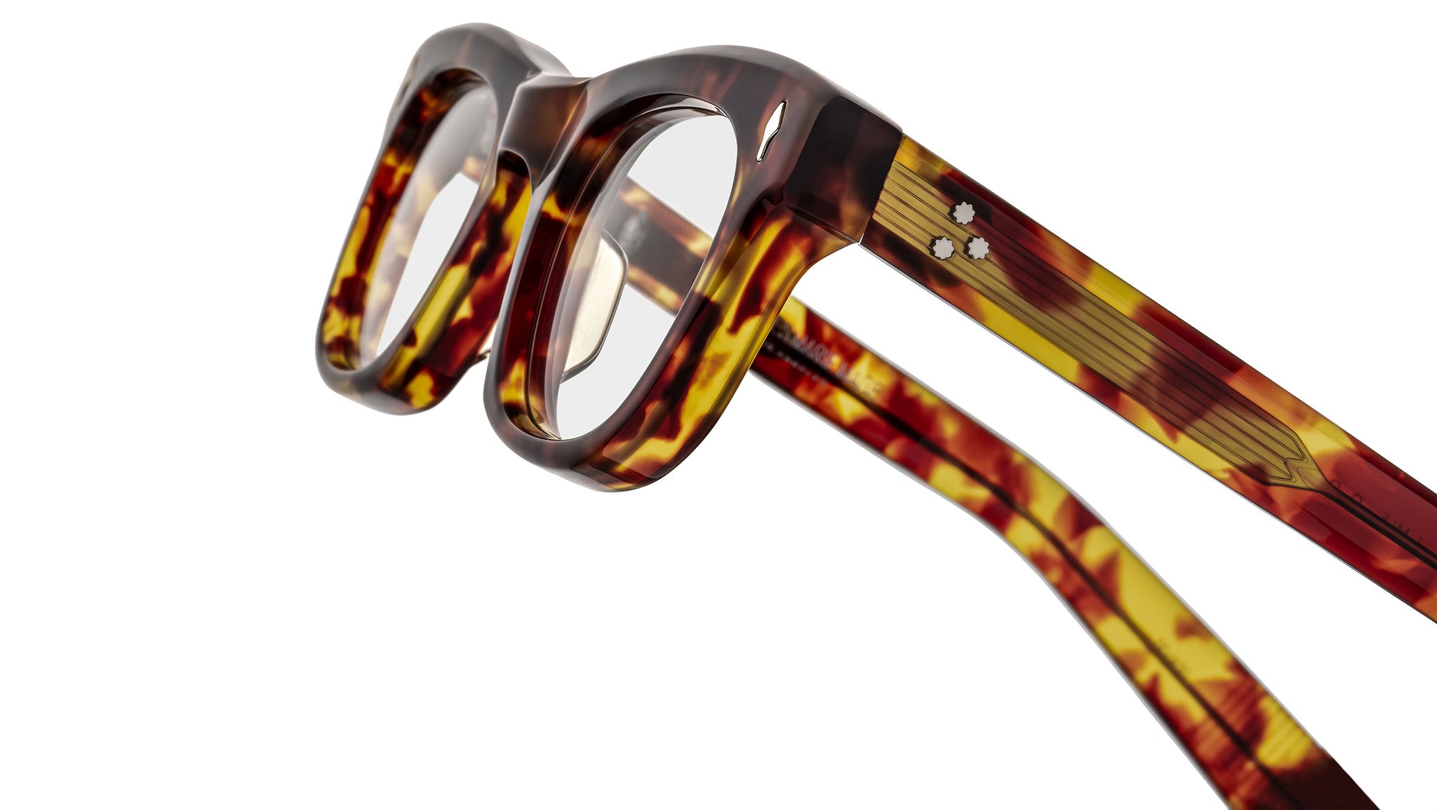 Havana 10mm cured cellulose acetate frame with custom double-laminated acetate temples, accented by precious metal hardware and primary light green lenses. Features a sterling silver signature arrowhead front pin, hidden silver classic wirecore, and a silver tension-secured custom 7-barrel hairline hinge. Equipped with superlight green CR-39 4 base lenses featuring backside anti-reflective treatment.