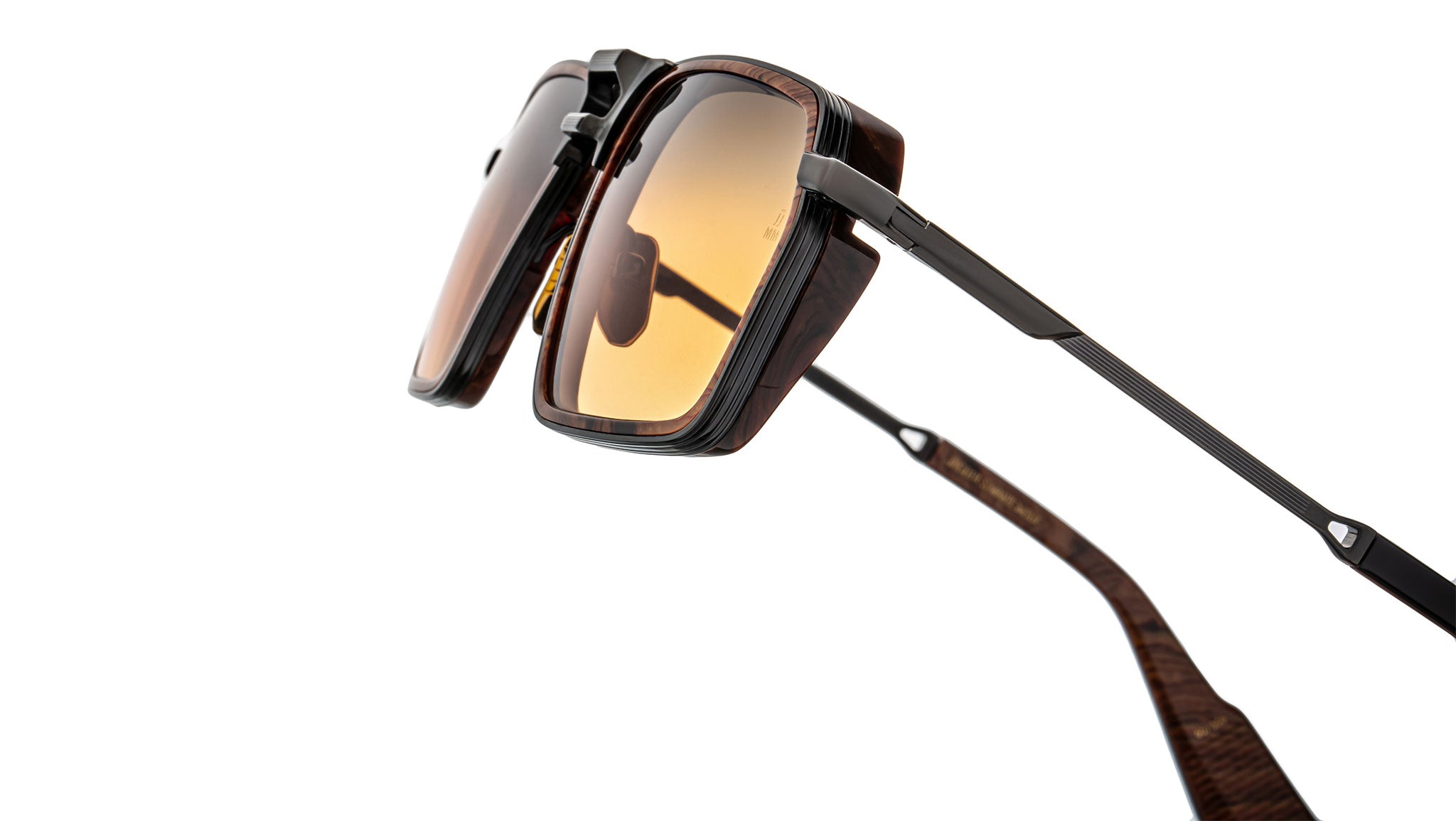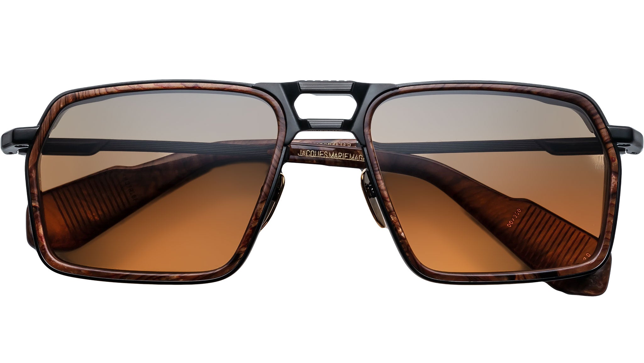 This sophisticated design features a black 100% beta titanium frame with 11mm brown cured cellulose acetate inserts and Burlwood acetate eyerim detailing, paired with Boa triple gradient CR-39 4-base lenses offering backside anti-reflective treatment. Black hairline-engraved titanium temples with acetate tips, a black tension-secured custom 917 hinge, and custom nose pads with logo and fine hairline engraving complete the construction, showcasing meticulous craftsmanship and refined elegance.