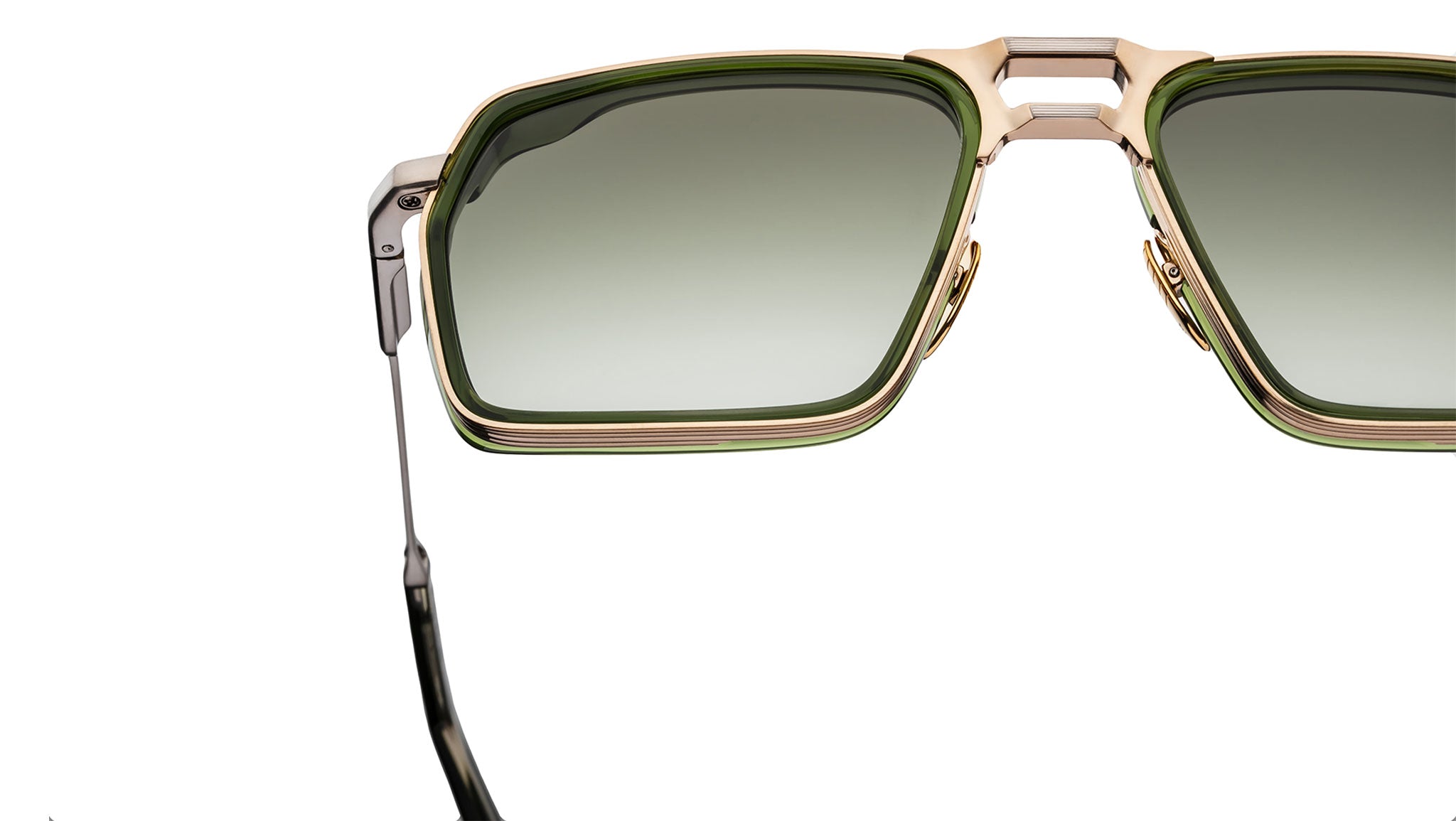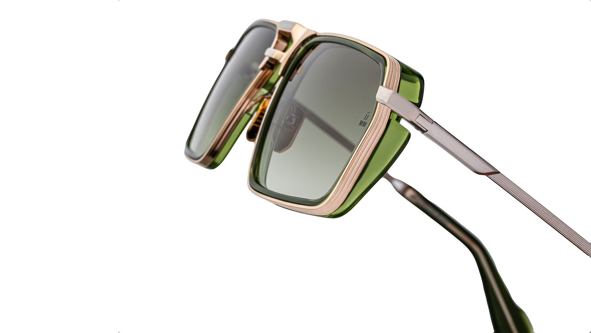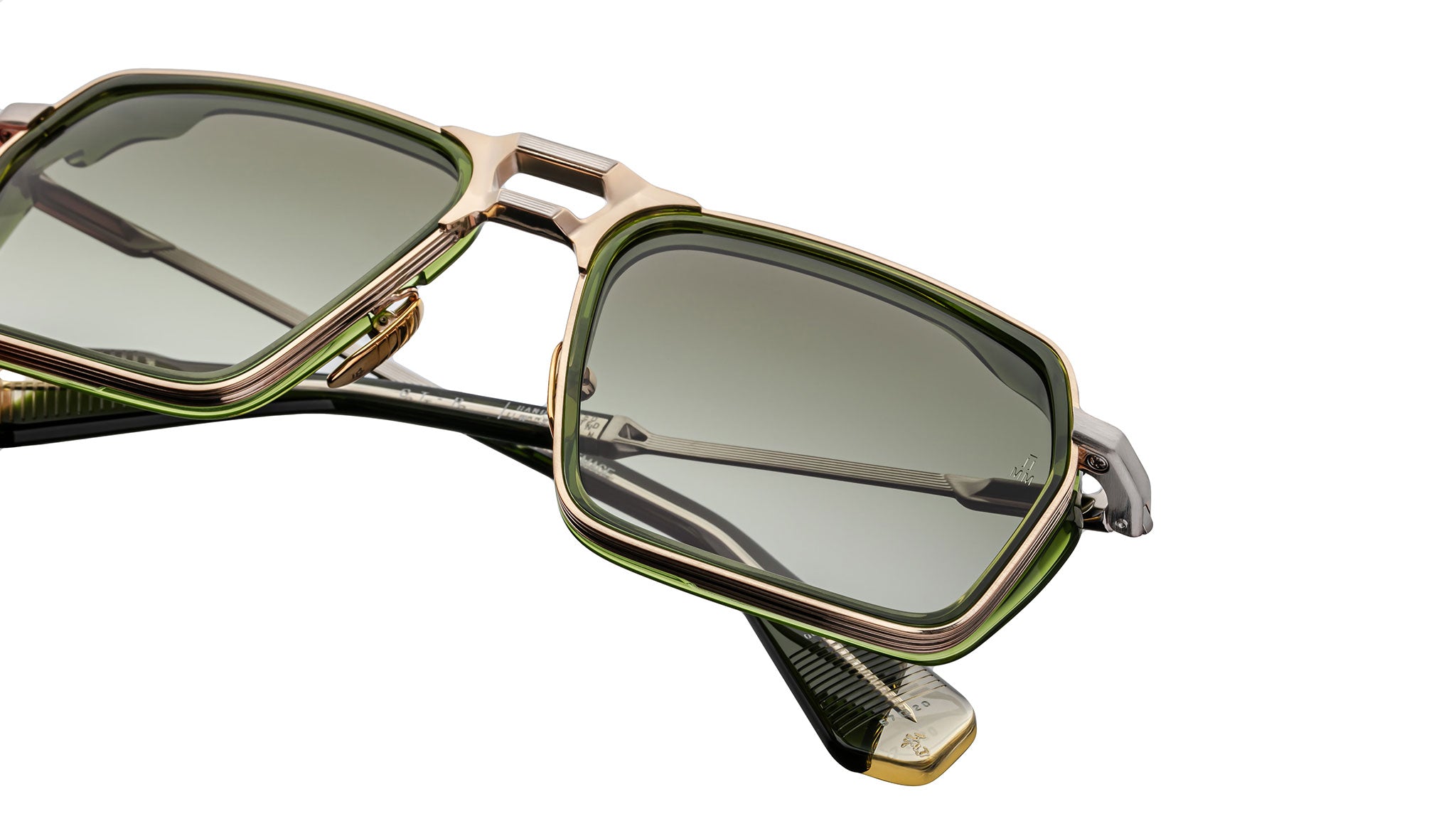 This refined design features a light gold 100% beta titanium frame with 11mm green cured cellulose acetate inserts and green acetate eyerim detailing, paired with light bottle green gradient CR-39 4-base lenses offering backside anti-reflective treatment. The construction includes light gold hairline-engraved titanium temples with acetate tips, a light gold tension-secured custom 917 hinge, and custom nose pads engraved with a logo and fine hairline detailing, blending precision engineering with sophisticated aesthetics.