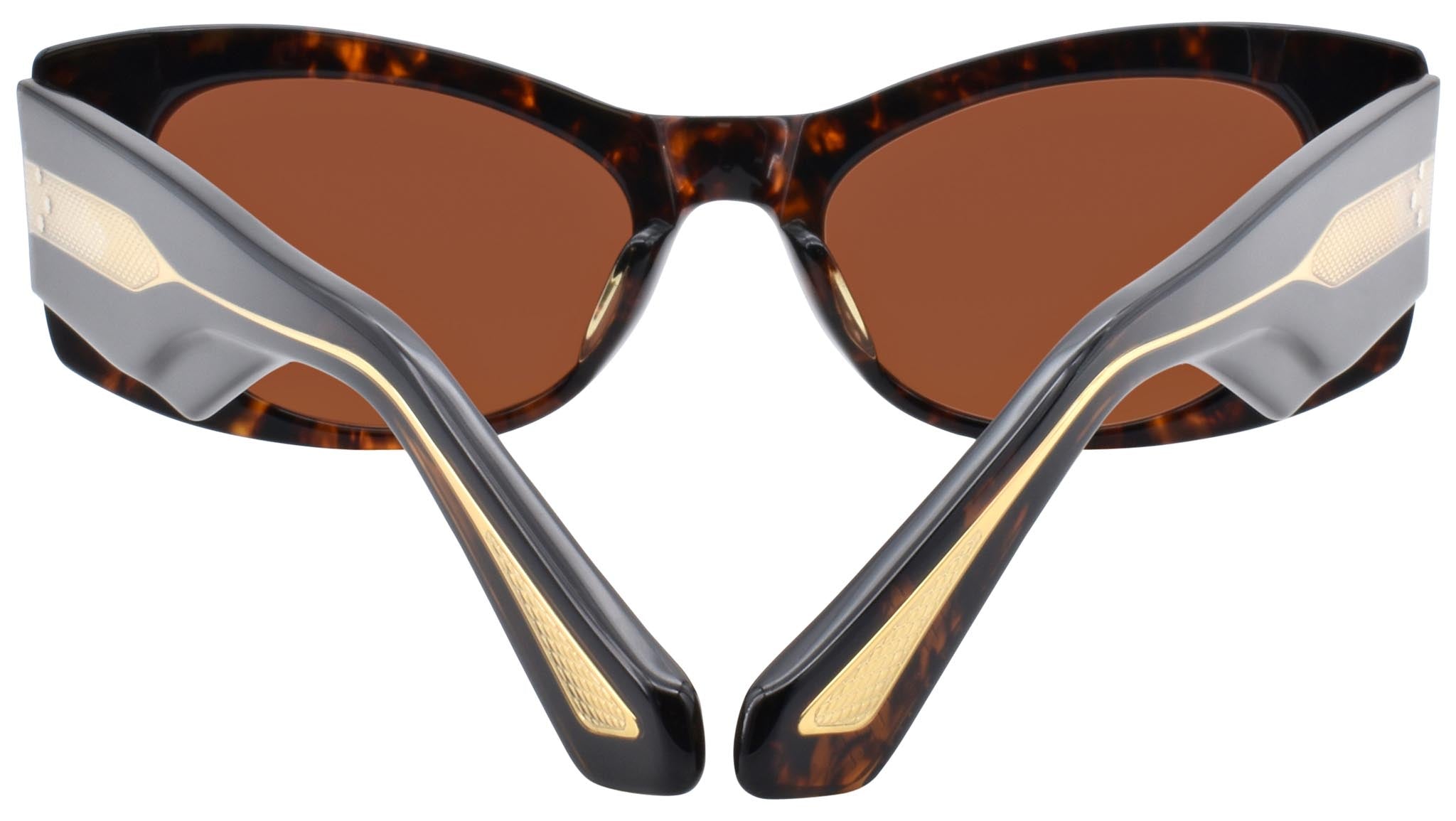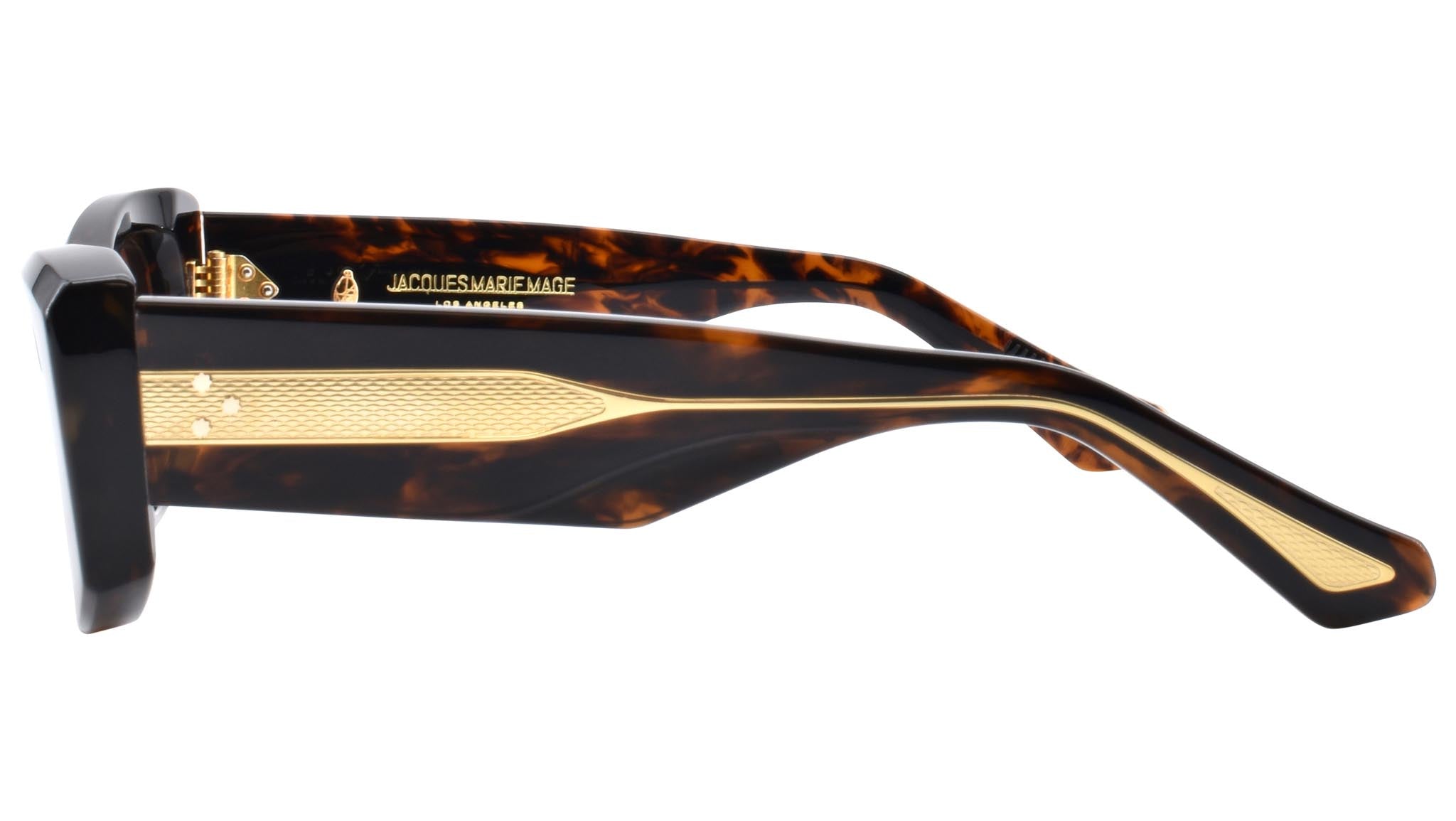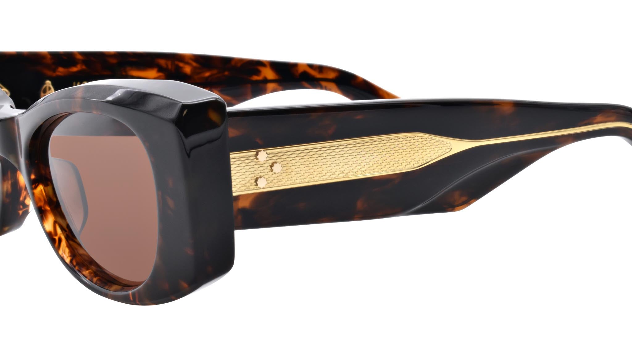 Brown 10 mm cured cellulose acetate frame. Custom double laminated acetate temples, featuring precious metal hardware and brown lenses. Exposed outer temple, dark gold custom hairline engraved wirecore. Tension-secured custom 9 barrel hinge. Sienna CR-39 4 base lens with backside anti-reflective treatment. 100% UV protection.