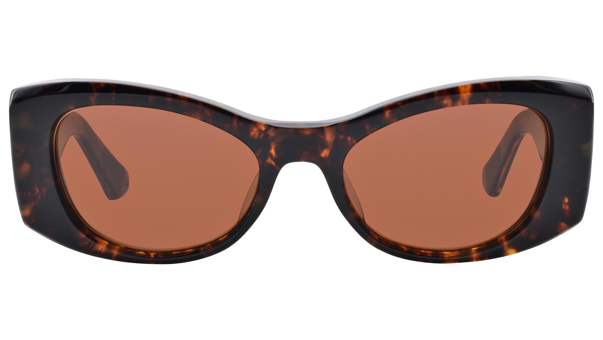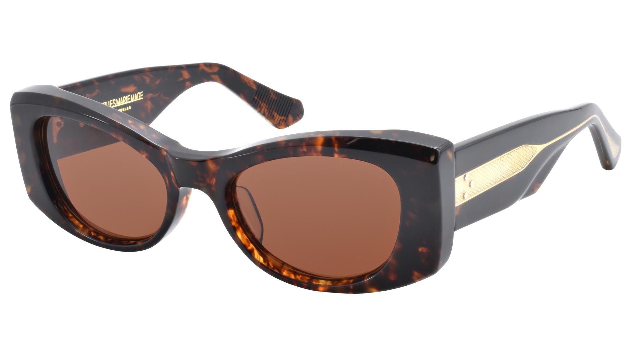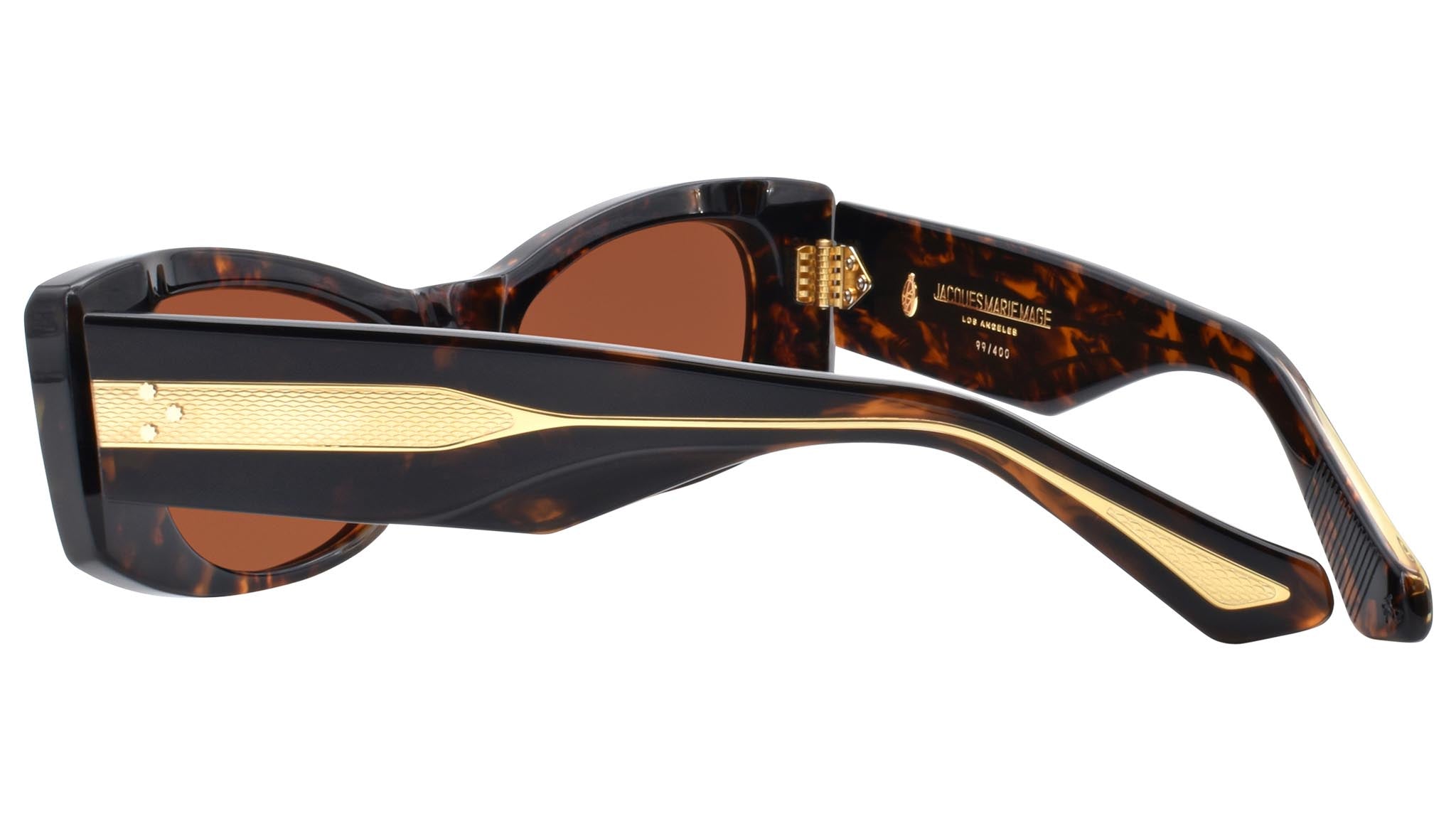 Brown 10 mm cured cellulose acetate frame. Custom double laminated acetate temples, featuring precious metal hardware and brown lenses. Exposed outer temple, dark gold custom hairline engraved wirecore. Tension-secured custom 9 barrel hinge. Sienna CR-39 4 base lens with backside anti-reflective treatment. 100% UV protection.