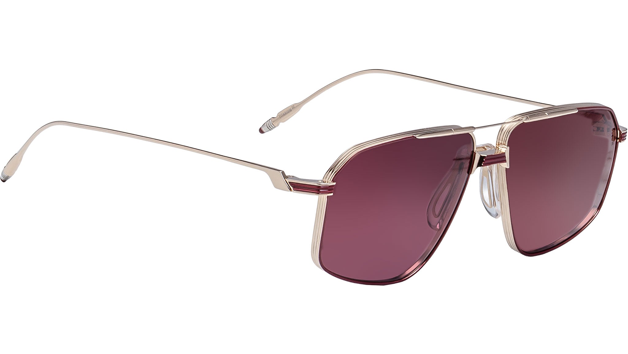 Crafted from 100% beta titanium, the light gold frame of these sunglasses is enhanced with refined gold accents, offering a lightweight yet resilient structure. The design features custom monoblock hinge construction for seamless durability and silver and burgundy epoxy tailfin temple tips that provide a distinctive touch. Fitted with mahogany gradient CR-39 lenses, these sunglasses deliver superior visual clarity and comfort, further enhanced by a backside anti-reflective treatment and a 4-base curve for a balanced, elegant profile.