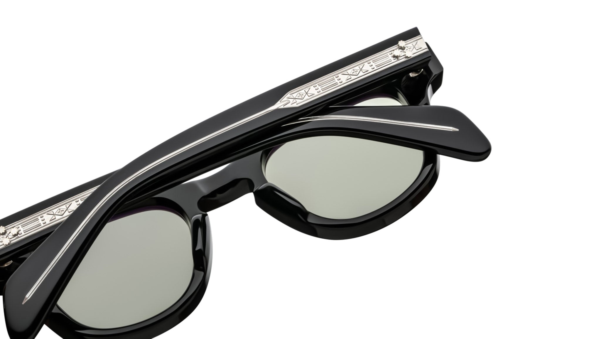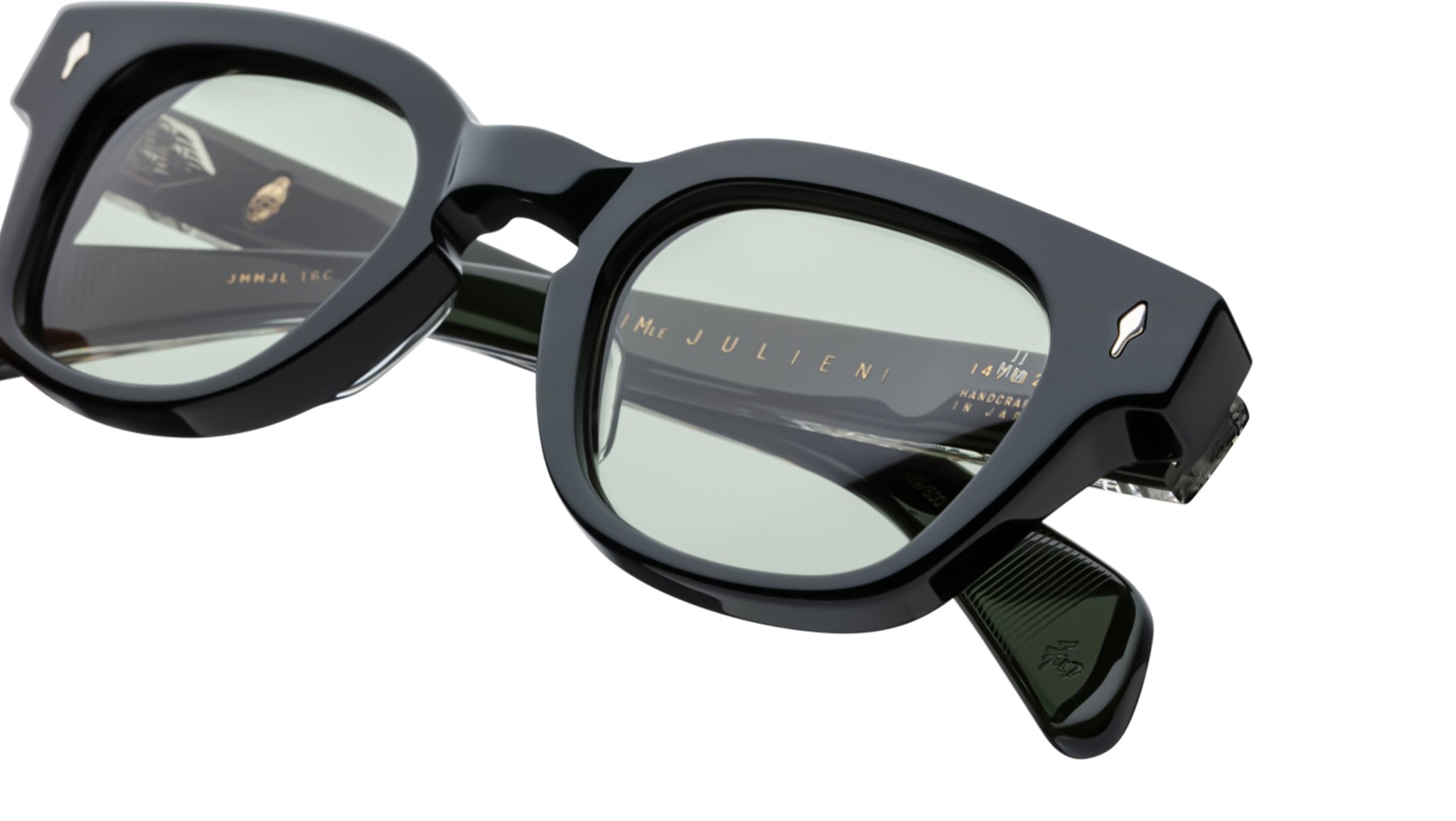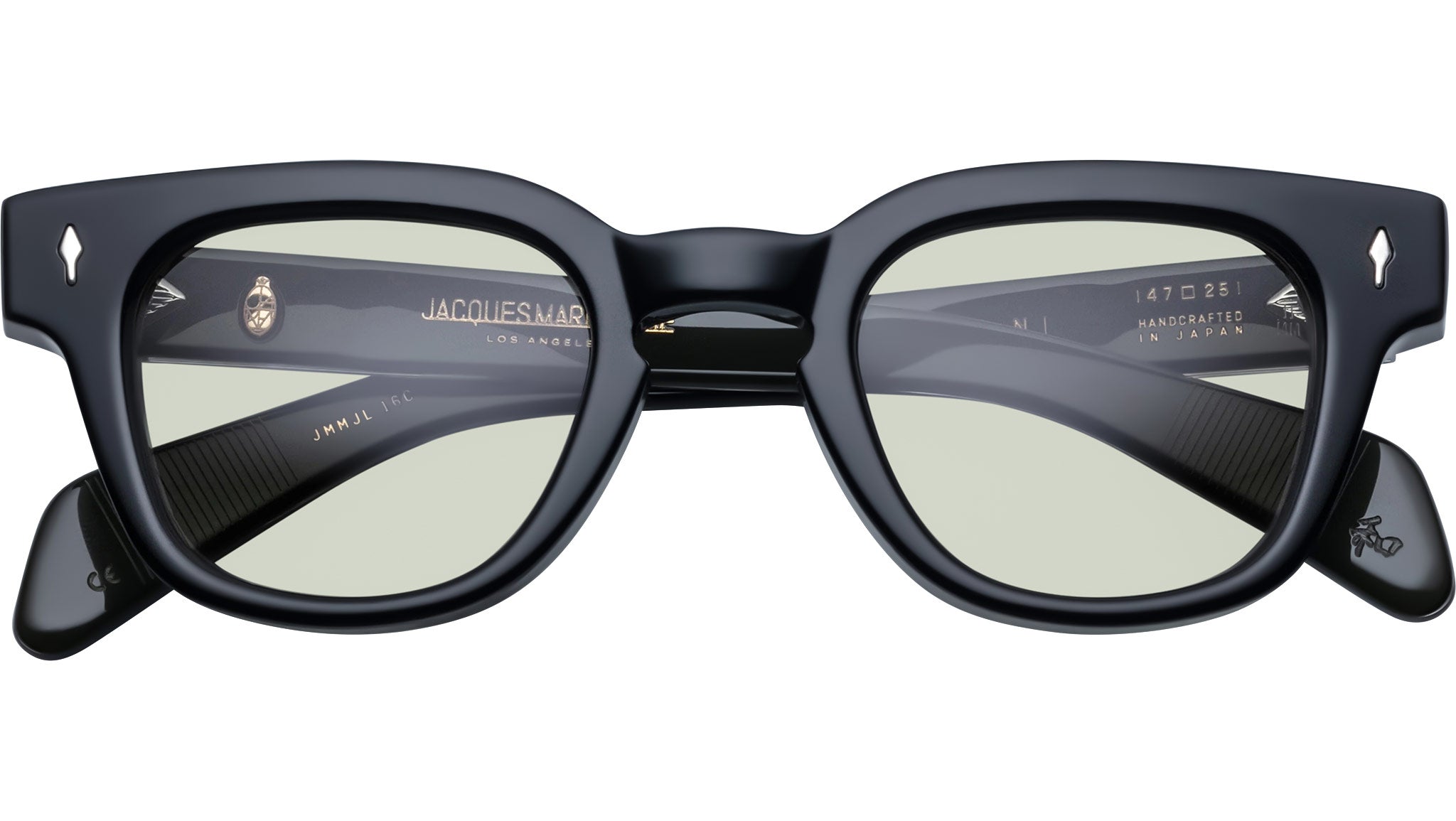 Black 10mm cured cellulose acetate frame with custom double-laminated acetate temples, detailed with precious metal hardware and green lenses. Silver signature arrowhead front pins and a silver exposed outer wirecore highlight the construction. Equipped with tension-secured custom 7-barrel hinges for lasting performance. Light bottle green CR-39 6 base lenses feature a backside anti-reflective treatment and provide 100% UV protection. Square shape.