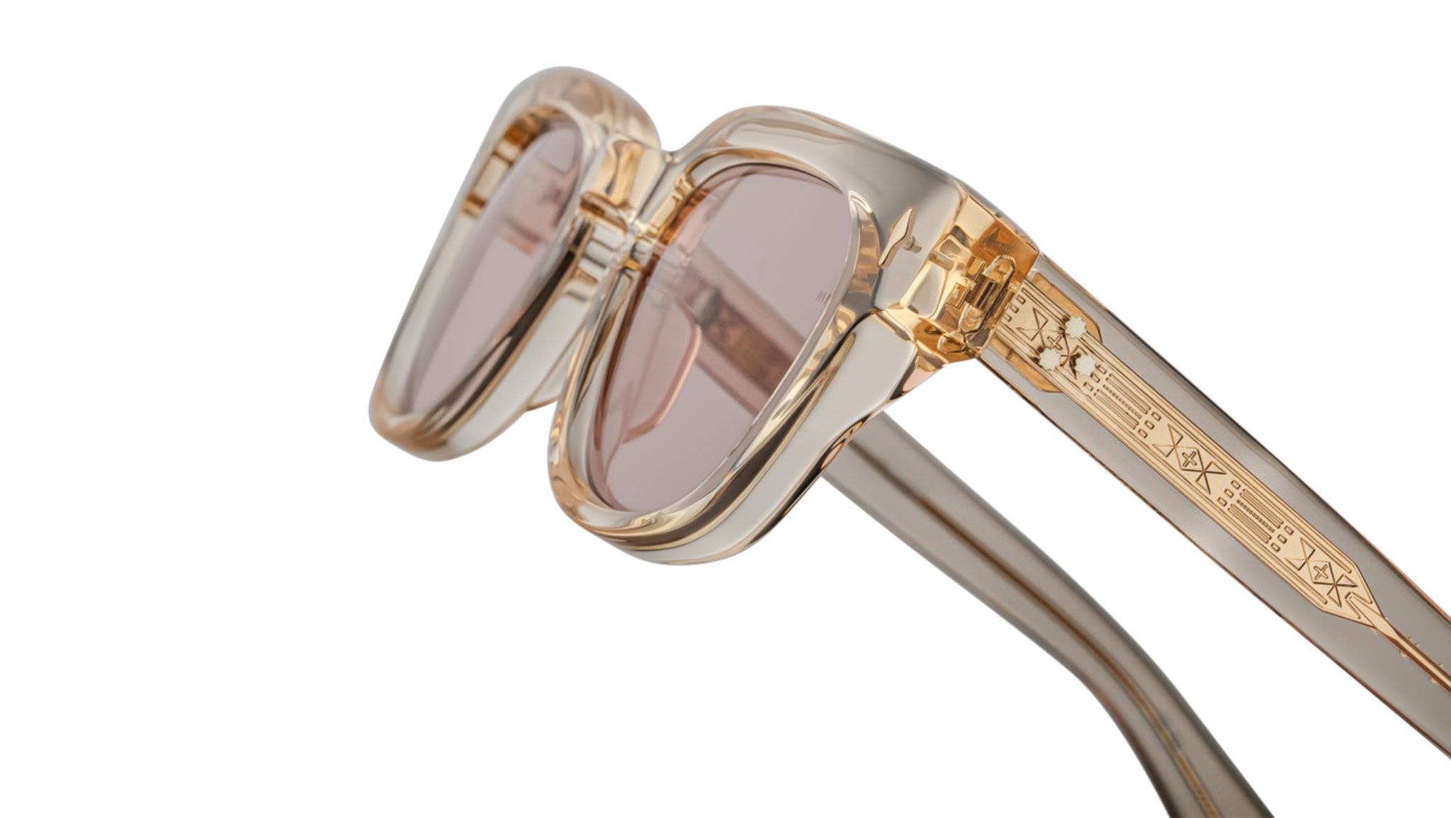 Pink crystal 10mm cured cellulose acetate frame with custom double-laminated acetate temples, accented by precious metal hardware and pink lenses. Features a light gold signature arrowhead front pin and an exposed inner wirecore for refined structure. Tension-secured custom 7-barrel hinges ensure durability. Dusty mauve CR-39 6 base lenses include a backside anti-reflective treatment and provide 100% UV protection. Square shape.